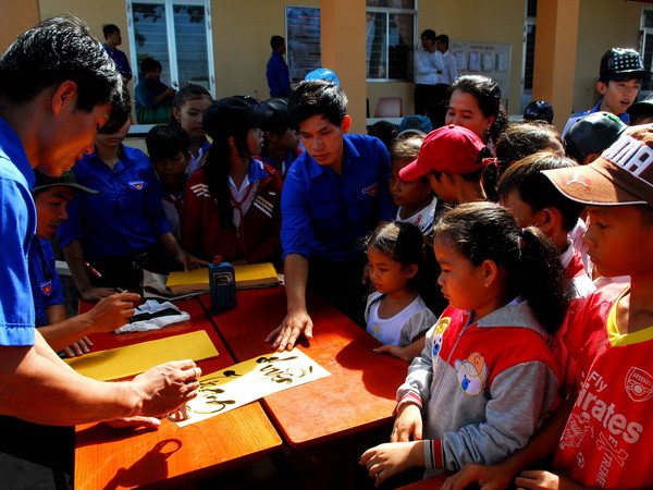 Các em nhỏ với một bức thư pháp từ gian hàng ông đồ của chương trình “Vui hè cùng thiếu nhi vùng biên.”