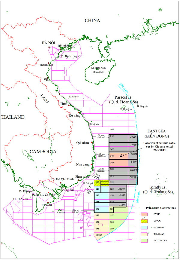 Bản đồ chỉ rõ 9 lô dầu khí mà Tổng Công ty Dầu khí Hải Dương Trung Quốc (CNOOC) mở thầu quốc tế hoàn toàn nằm trong vùng đặc quyền kinh tế 200 hải lý và thềm lục địa của Việt Nam.