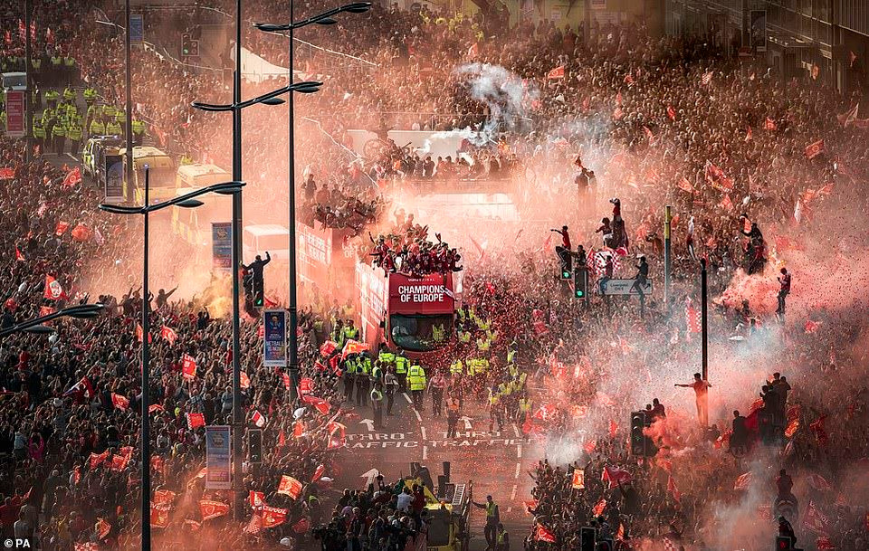 Sau khi giành chức vô địch Champions League, những người hùng của Liverpool đã trở về trong sự chào đón của "biển người" kèm theo sắc đỏ của khói màu và pháo giấy.