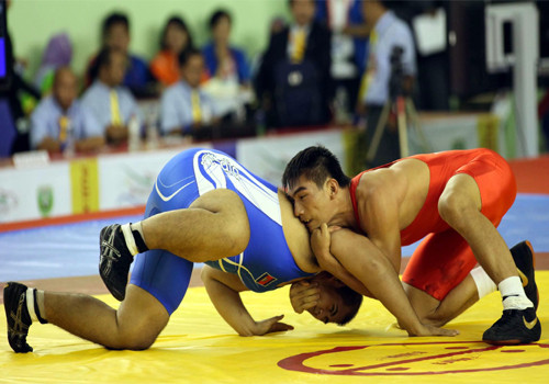 Đô vật Bùi Tuấn Anh (áo đỏ) đoạt HCV hạng cân 66 kg nam