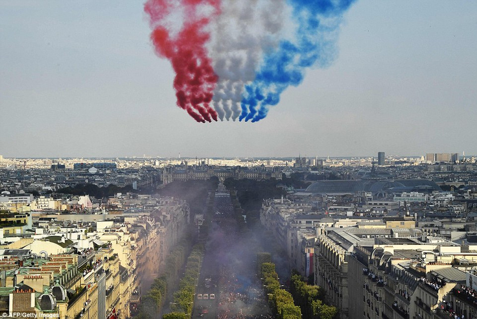 Thủ thành Hugo Lloris dẫn dầu đội tuyển Pháp rước cúp về Paris sau chiến thắng thuyết phục 4-2 trước Croatia ở chung kết. Paul Pogba (trái), người đã ghi bàn ở trận chung kết, hân hoan trước sự chào đón của người hâm mộ. Chiếc xe được chuuẩn bị sẵn để đón nhà vô địch thế giới ở sân bay. Hàng trăm nghìn người đã xếp hàng chào đón xe bus của đội tuyển Pháp tại đại lộ Champs Elysees. Ước tính có đến 500.000 người hâm mộ đổ về Paris... ...để tham dự buổi lễ rước cúp của tuyển Pháp. Tất cả đều đang háo hứng chào đón những người hùng của đất nước trở về. Và, nhà vô địch thế giới đã xuất hiện với sự bảo vệ nghiêm ngặt của đội ngũ an ninh. Những người hùng của nước Pháp hòa vào người hâm mộ. Máy bay biểu diễn nhả khói thành màu của lá cờ nước Pháp để chào đón đội tuyển Pháp. Theo sát chiếc xe buýt màu xanh là những cảnh sát tinh nhuệ và những chiếc xe cứu thương. Pogba chụp ảnh kỷ niệm cùng phu nhân Tổng thống Pháp. Thành viên đội tuyển Pháp chụp hình cùng Tổng thống Macron và phu nhân. ...và cả tạo hình đầy tinh nghịch. Cận cảnh 'biển người' chào đón nhà vô địch Pháp rước cúp về Paris