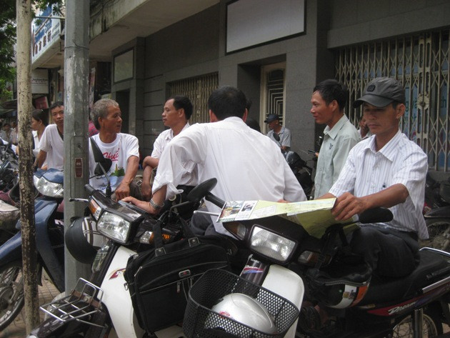Người nhà thí sinh ngồi ngay vỉa hè đợi con em thi. (Ảnh: PV/Vietnam+)