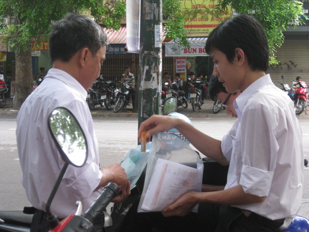 Kiểm tra kỹ càng giấy tờ, dụng cụ làm bài trước khi vào thi. (Ảnh: PV/Vietnam+)