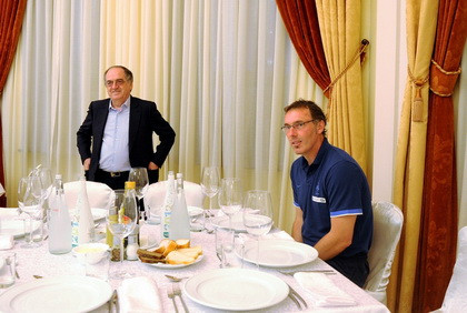 Chủ tịch Liên đoàn bóng đá Pháp Noel Le Great và huấn luyện viên Laurent Blanc tươi tỉnh trước bữa ăn