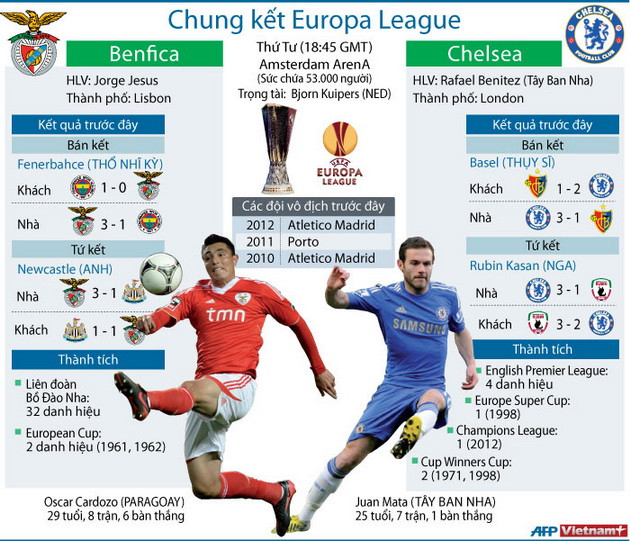 - Đây sẽ là trận chung kết cúp châu Âu thứ 9 của Benfica và Chelsea mới có 5 lần.Tuy nhiên, khi xét về số lượng các danh hiệu thì The Blues đang dẫn trước với tỉsố 3-2.