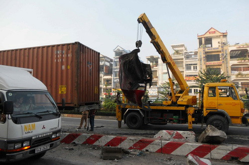 Đến 7 giờ, xe cứu hộ mới đến nhưng chỉ kéo phần đầu kéo đi nơi khác, còn rơmoocvẫn nằm lại hiện trường cùng nhiều mảng bê tông của dải phân cách bị vỡ nằm lănlóc trên đường.