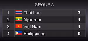 Với kết quả này, tuyển Thái Lan tạm giữ ngôi đầu bảng A. Hai đội tuyểnViệt Nam và Myanmar ở vị trí kế tiếp. Philippines đứng cuối bảng.