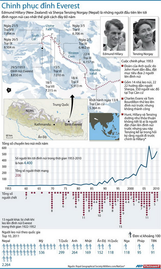 Hãy cùng Vietnam+ điểm lại những cột mốc đáng nhớ trong cuộc hành trình chinh phục đỉnh Everest cách đây 60 năm: