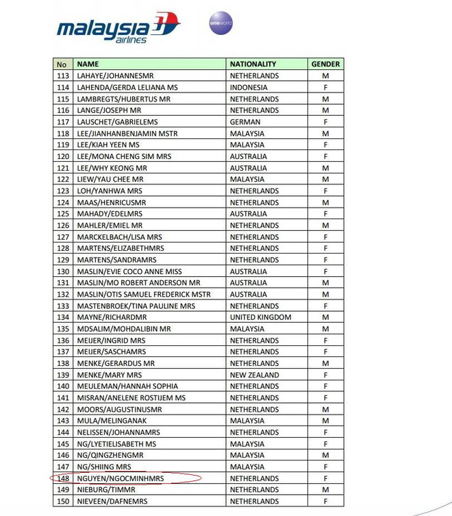 Danh sách đầy đủ của 298 người trên chuyến bay MH17 xem tại đây.