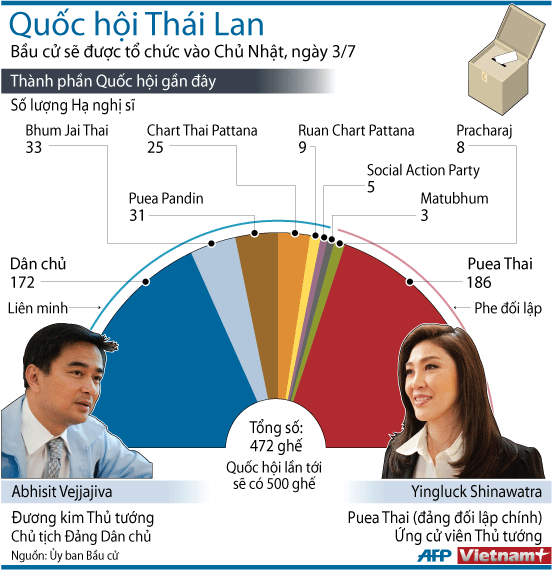 Cuộc bầu cử này được dự báo là cuộc đua tranh quyết liệt giữa hai đảng lớn là đảng đối lập Puea Thai và đảng Dân chủ cầm quyền - đảng lâu đời nhất ở Thái Lan.