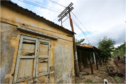 Nói đoạn, anh thủng thẳng chỉ cho chúng tôi thấy dãy công trình ngay gần ga mà trước đây anh em làm công tác cầu đường dùng để ở. Đó là một khu nhà mái bằng được quét ve vàng nằm hướng lưng ra biển Đông. Mặc dù được chằng buộc khá kỹ nhưng một vài cánh cửa sổ vẫn bị giật tung ra, kính vỡ, tôn thủng ngổn ngang.