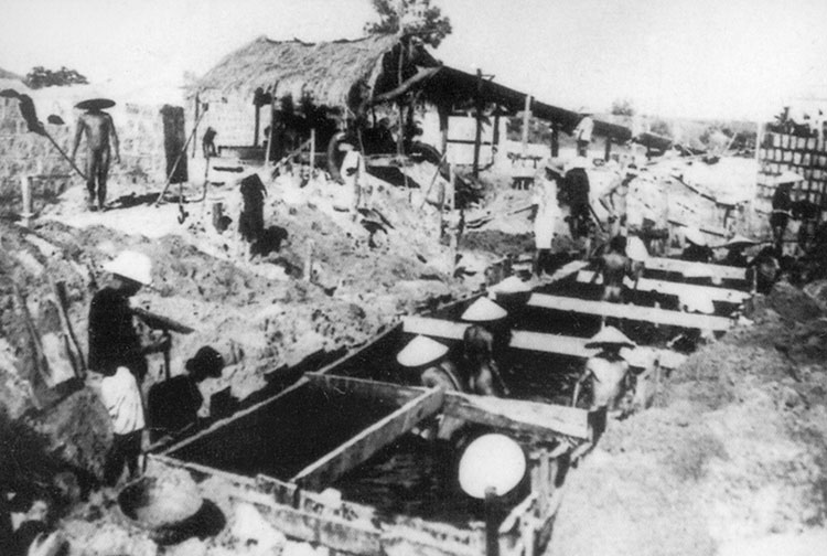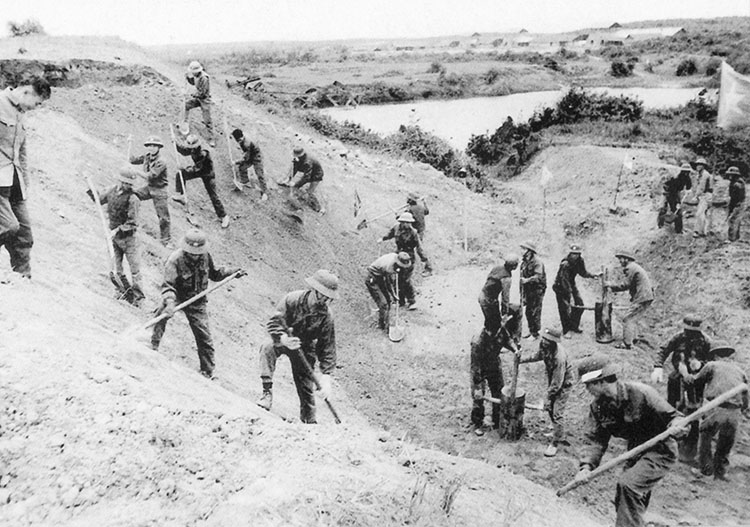 Đại đội 4 pháo cao xạ Sông Gianh san lấp hố bom trên đường sắt Tiên An - Minh Cầm tháng