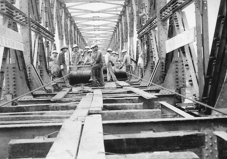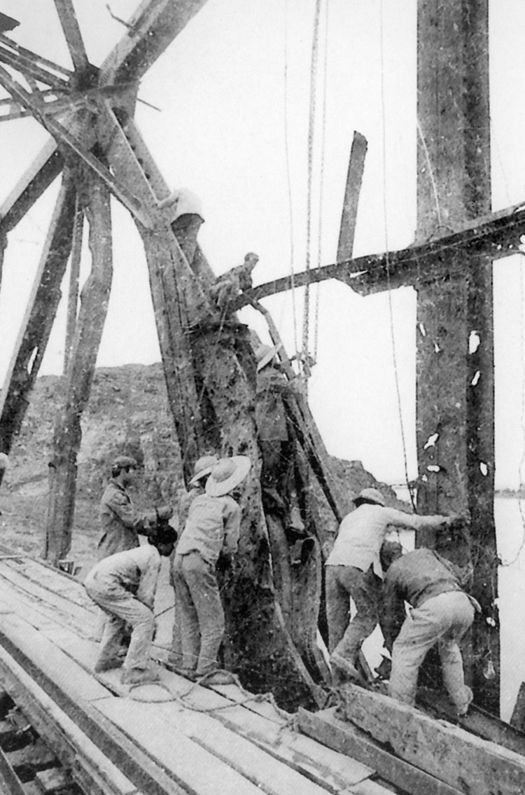 Lao lắp cầu Chợ Thượng qua sông La trên công trường đường sắt Thống Nhất 1976.