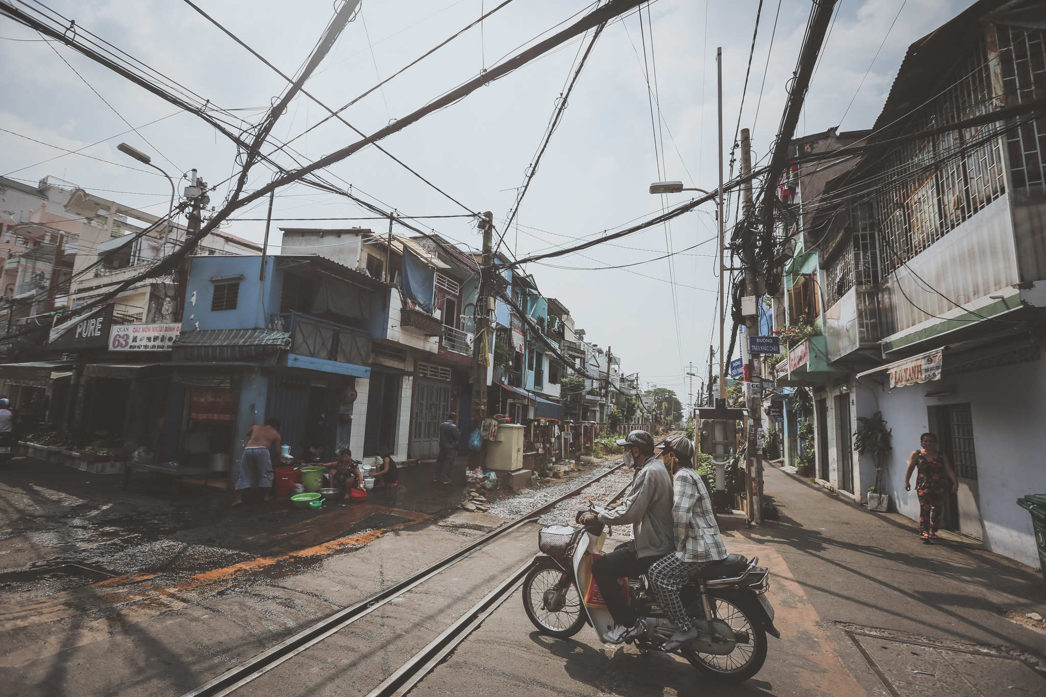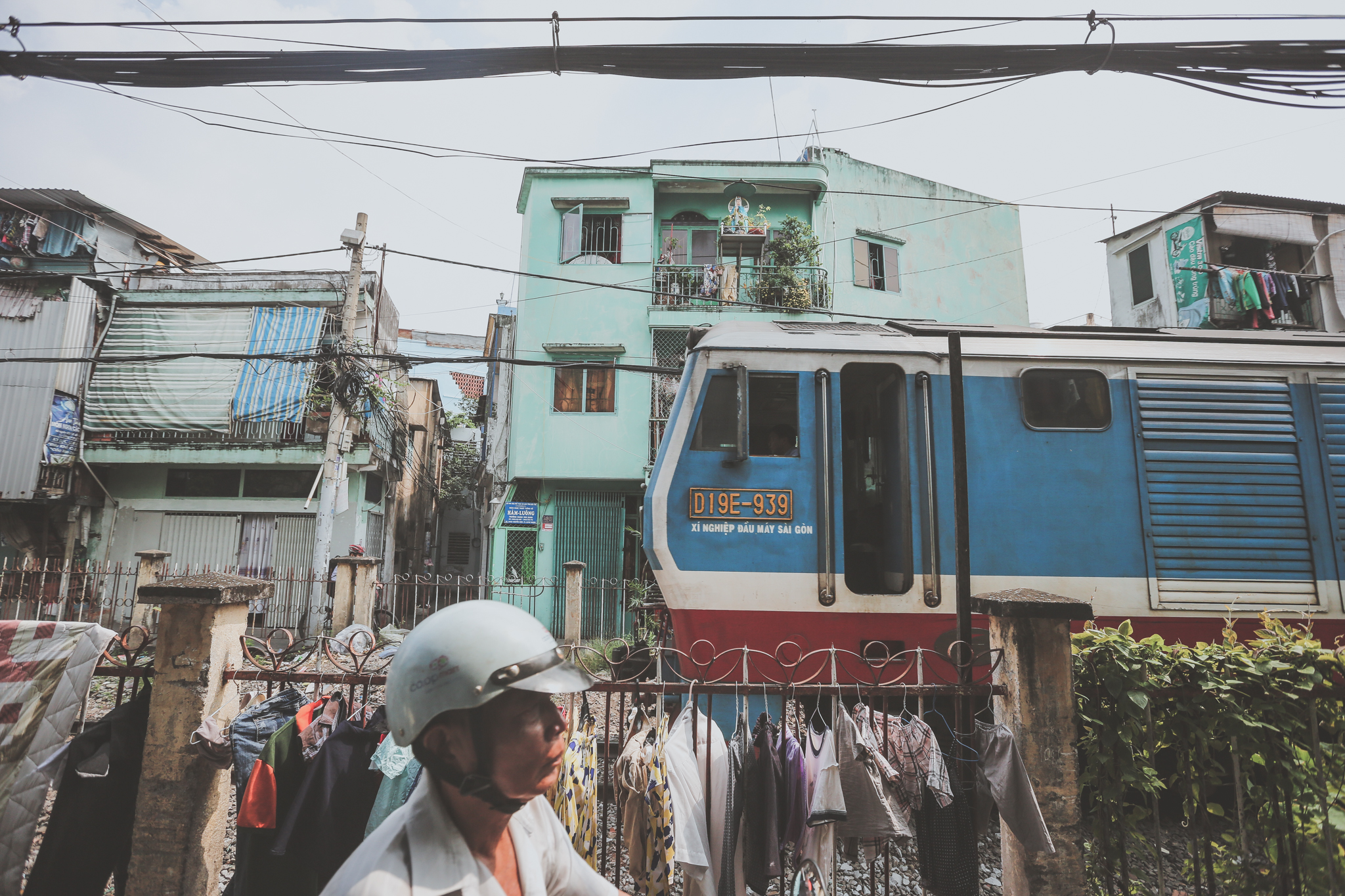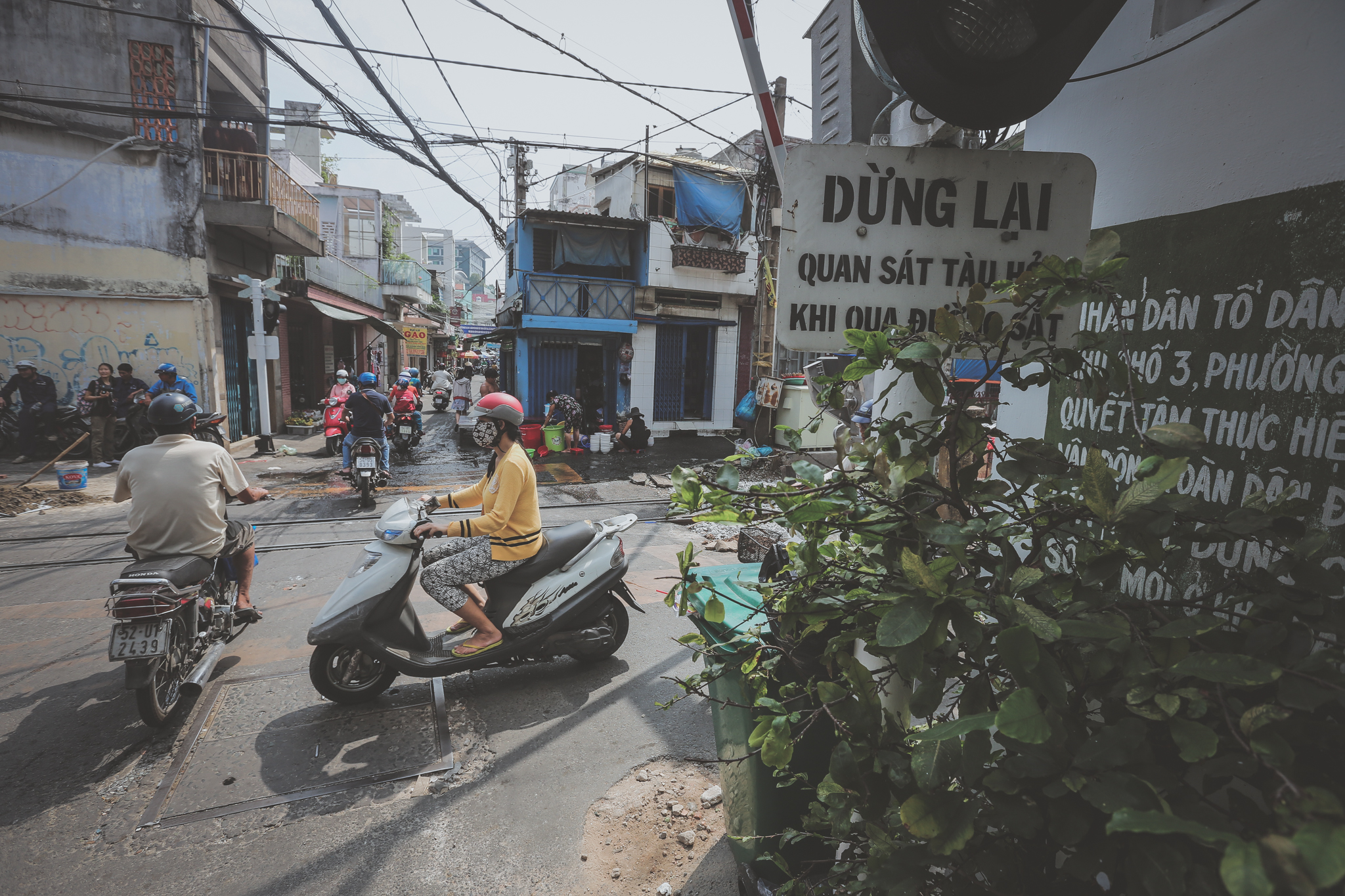 Cũng giống như các xóm đường tàu khác của Sài Gòn, xóm giao lộ đường Chiến Thắng và Trần Khắc Chân (Quận Phú Nhuận) khá nhộn nhịp dù là ngày hay đêm. Mỗi ngày có khoảng 10 chuyến tàu chạy qua. Ở đây, chuyện nghe thấy tiếng còi tàu là điều hết sức bình thường. Thế nhưng dù đã quen như thế, người dân ở đây vẫn rất vui khi nhìn thấy sự xuất hiện của những chuyến tàu, dù cho họ không hề sống bám vào nó. (Ảnh: Minh Sơn/Vietnam+)