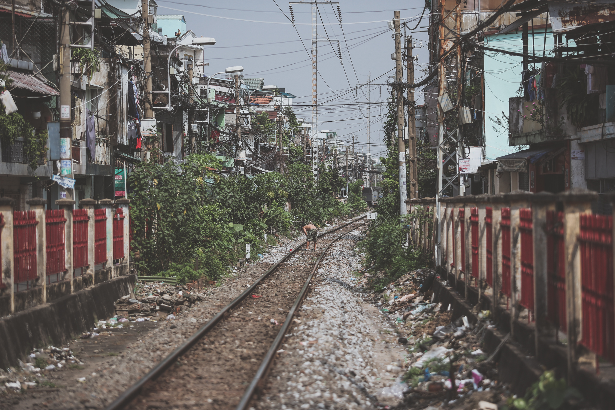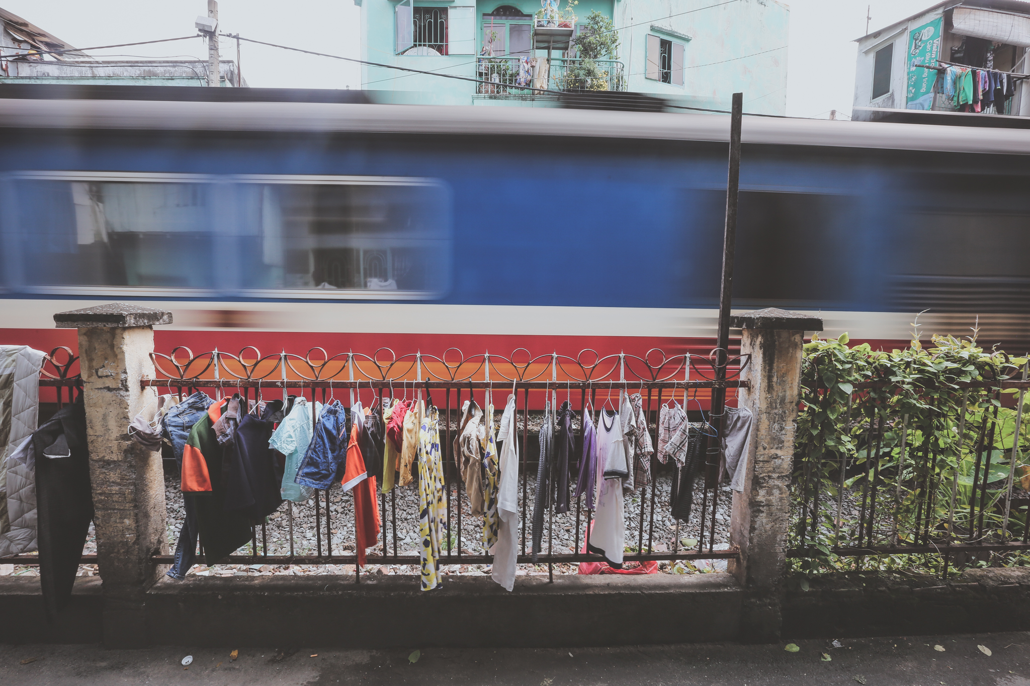 Nhiều người vẫn nghĩ sống cạnh đường ray với hằng hà những chuyến xe lửa xình xịch lao đi ầm ầm như sẵn sàng san ủi mọi thứ. (Ảnh: Minh Sơn/Vietnam+)