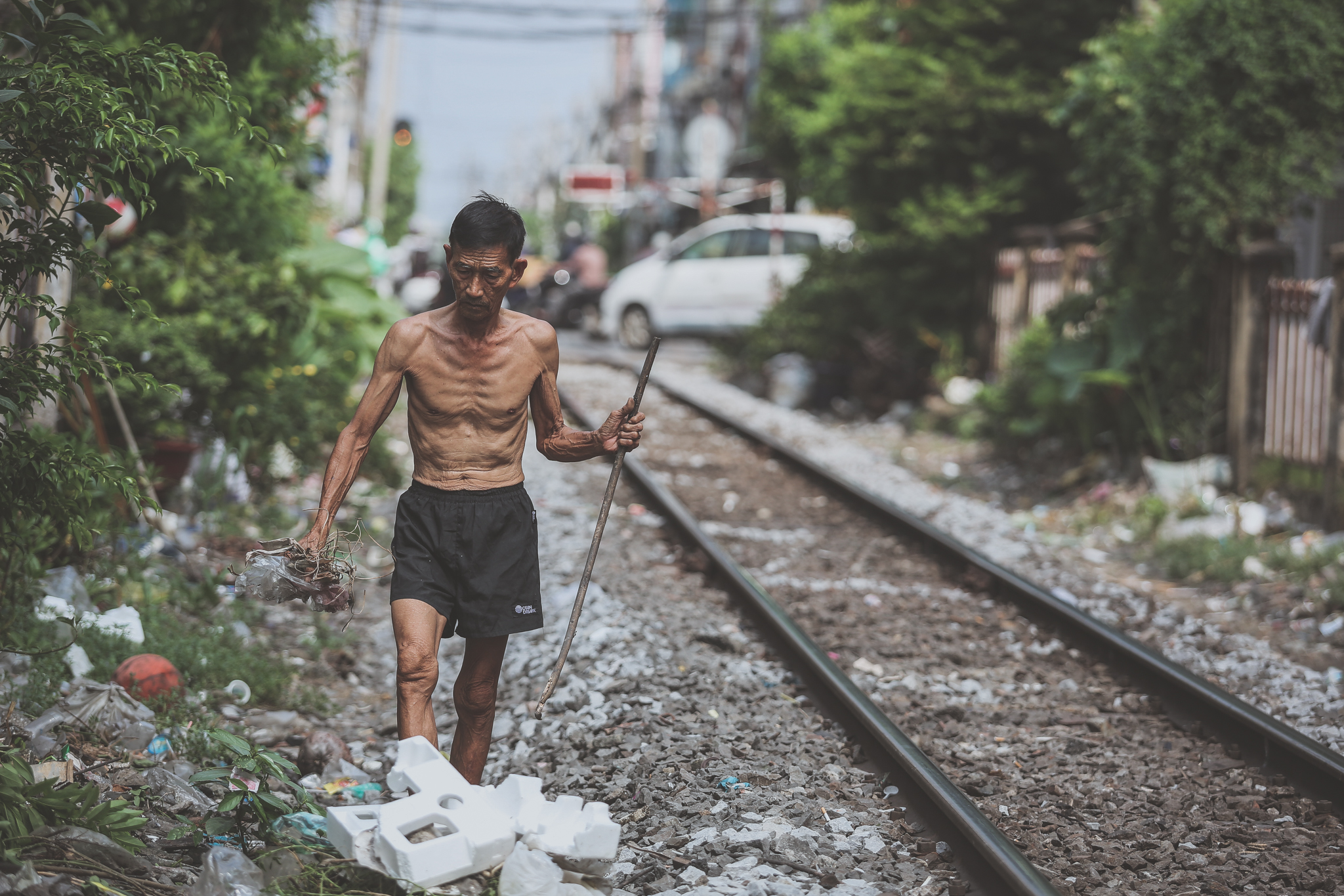 Chú Bùi Văn Thông (75 tuổi) đang cần mẫn đi nhặt từng cọng rác, túi nilon. Chú Thông đã sống bên đường tàu này hơn 40 năm. (Ảnh: Minh Sơn/Vietnam+)