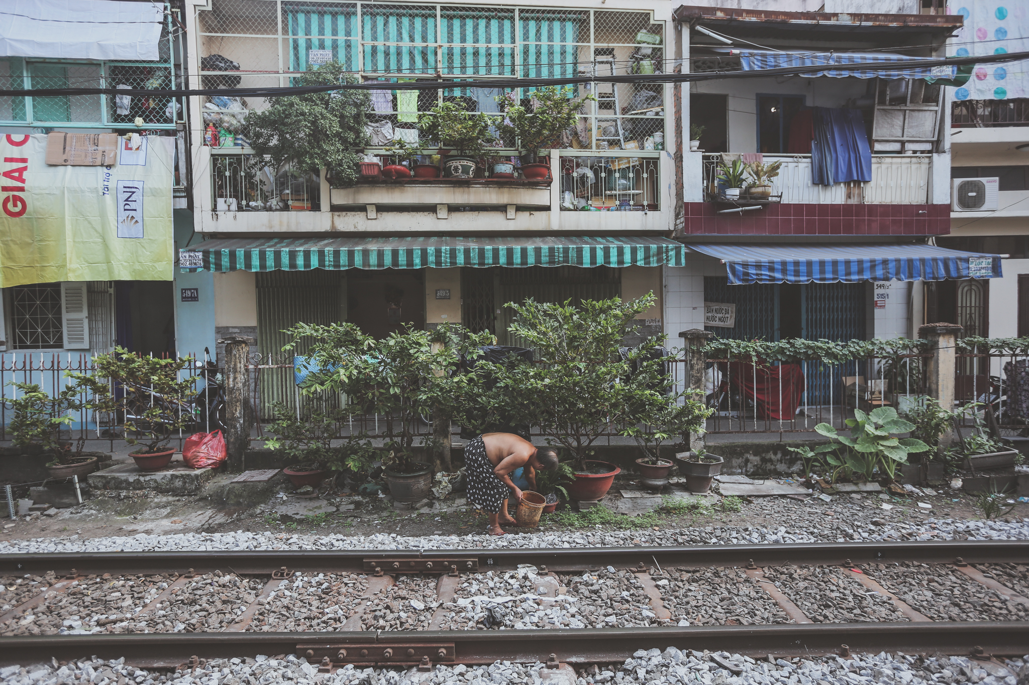 Thậm chỉ một số nơi tàu đi qua chỉ cách nhà dân chừng 5, 6 mét nhưng nó vẫn trở thành nơi mọi người sinh hoạt, trồng rau như mọi chuyện vẫn diễn ra bình thường như vậy. (Ảnh: Minh Sơn/Vietnam+)