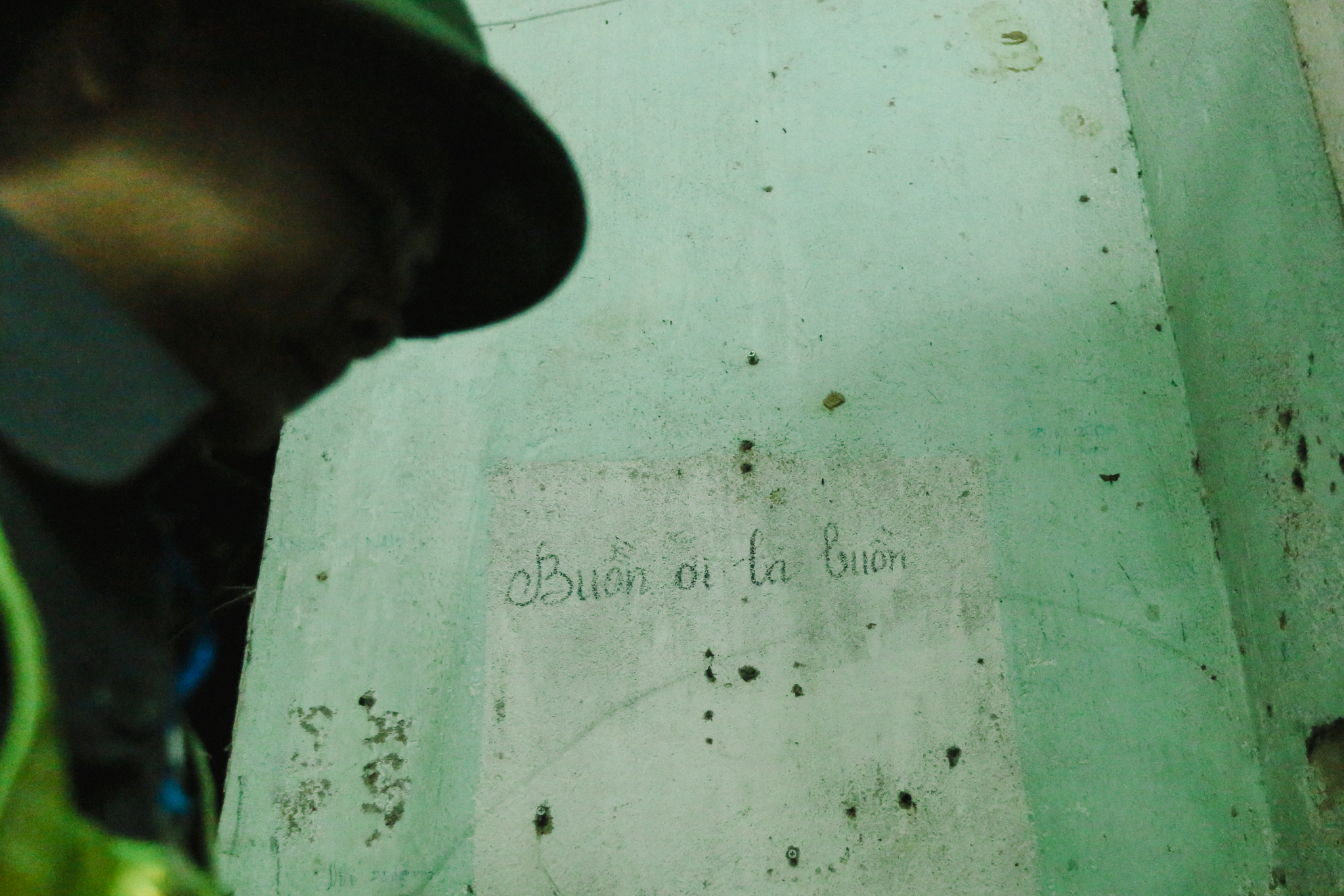 Công việc gác ghi buồn và nhàm chán đến mức, trong lúc chờ tàu qua, một nhân viên nào đó đã viết lên tường như giải tỏa nỗi buồn. (Ảnh: Minh Sơn/Vietnam+)