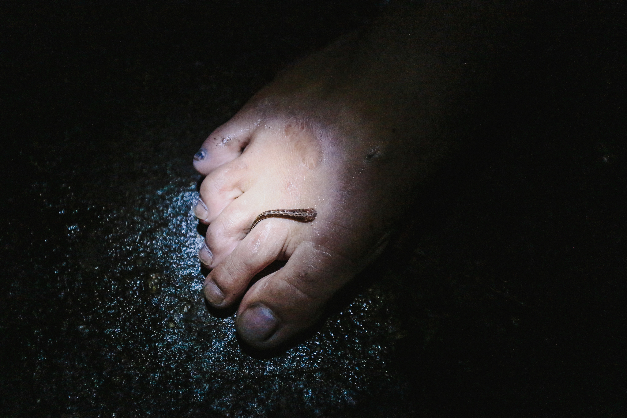 “Ở đây quanh năm chỉ làm bạn với rừng, với rắn và vắt thôi,” Nguyễn Xuân Cường nửa đùa, nửa thật. Nói là làm, cậu nhân viên gác ghi trẻ măng chỉ xuống đôi chân một đồng nghiệp đã có con đỉa bám tự lúc nào. (Ảnh: Minh Sơn/Vietnam+)
