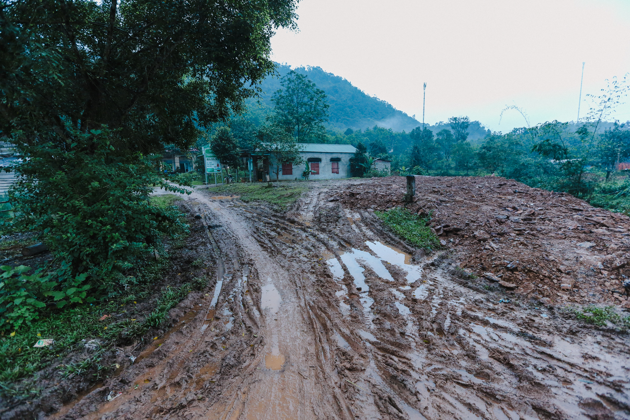 Mưa vẫn lây rây không dứt nguyên cả tuần khiến cho con đường độc đạo đi vào nhà ga lầy lội bùn đất. (Ảnh: Minh Sơn/Vietnam+)