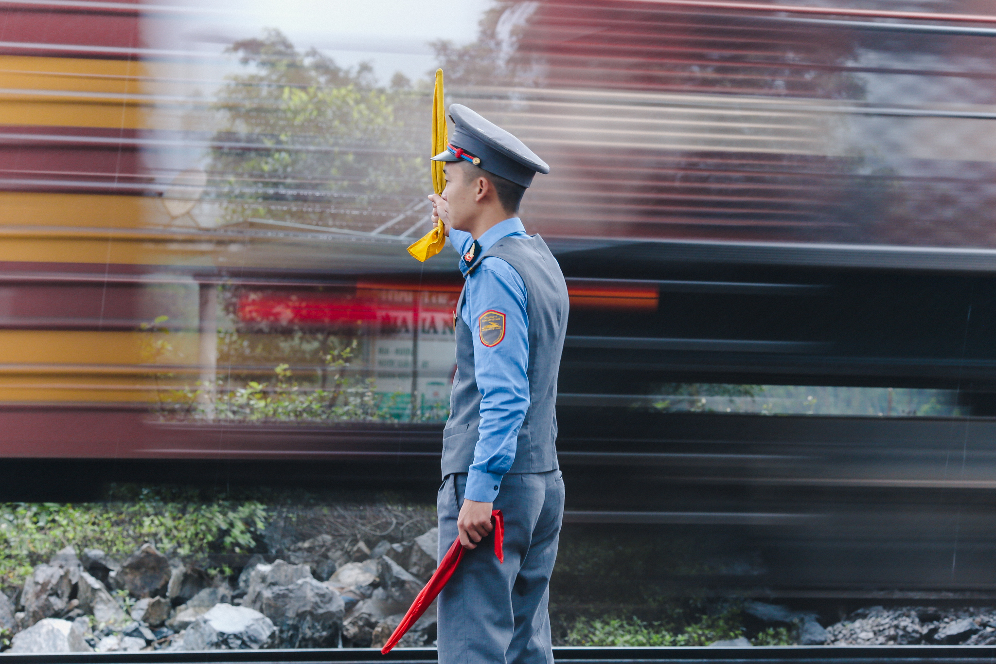 Ga lẻ là thế. Đón tàu nhiều, nhưng tàu chẳng bao giờ dừng lại. Những nhân viên gác chắn như Nguyễn Văn Hoàn giơ cờ hiệu lệnh an toàn cho chàu chạy qua rồi lại lặng lẽ vào phòng trực. (Ảnh: Minh Sơn/Vietnam+)