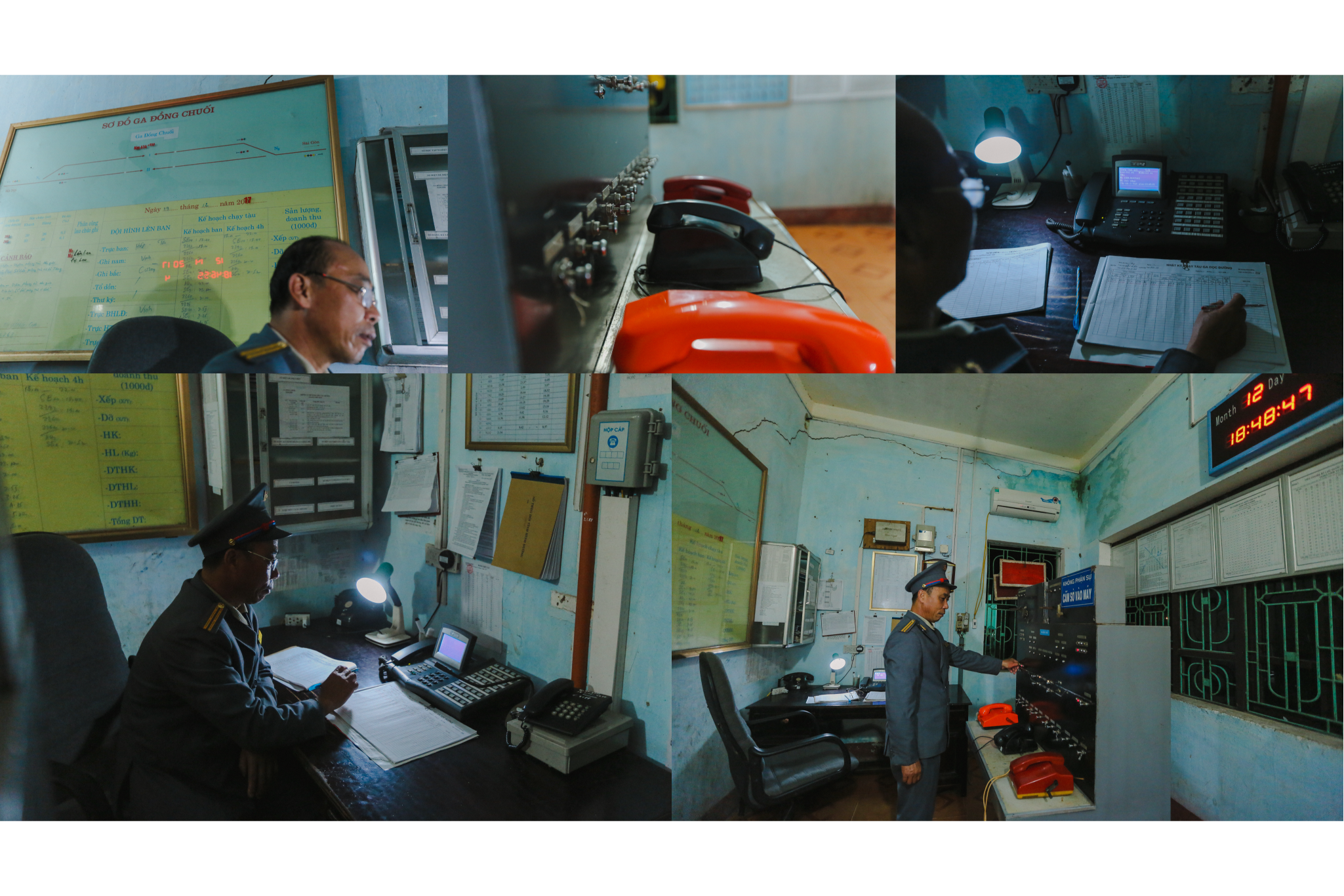 Điện thoại trực ban đổ chuông liên hồi báo đón tiễn tàu. Hai đường tránh gần như sử dụng hết công suất. Cứ một lúc lại có một đoàn tàu hàng được lệnh vào đường tránh để tàu khách Thống Nhất được ưu tiên thông qua. Anh Tân cùng hai nhân viên gác ghi đầu Bắc và Nam cũng liên tục phải đi từ phòng trực ra chòi gác. (Ảnh: Minh Sơn/Vietnam+)