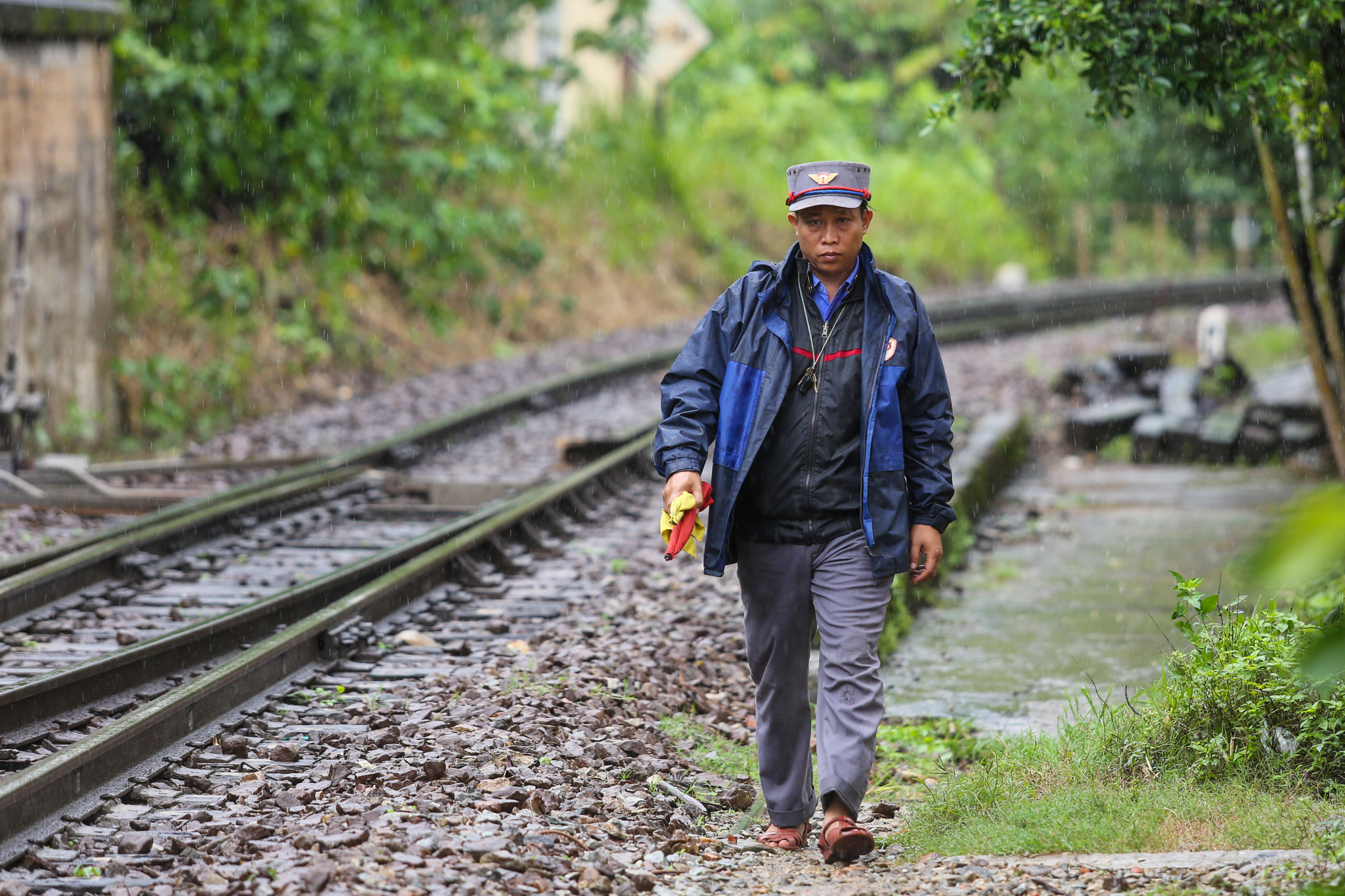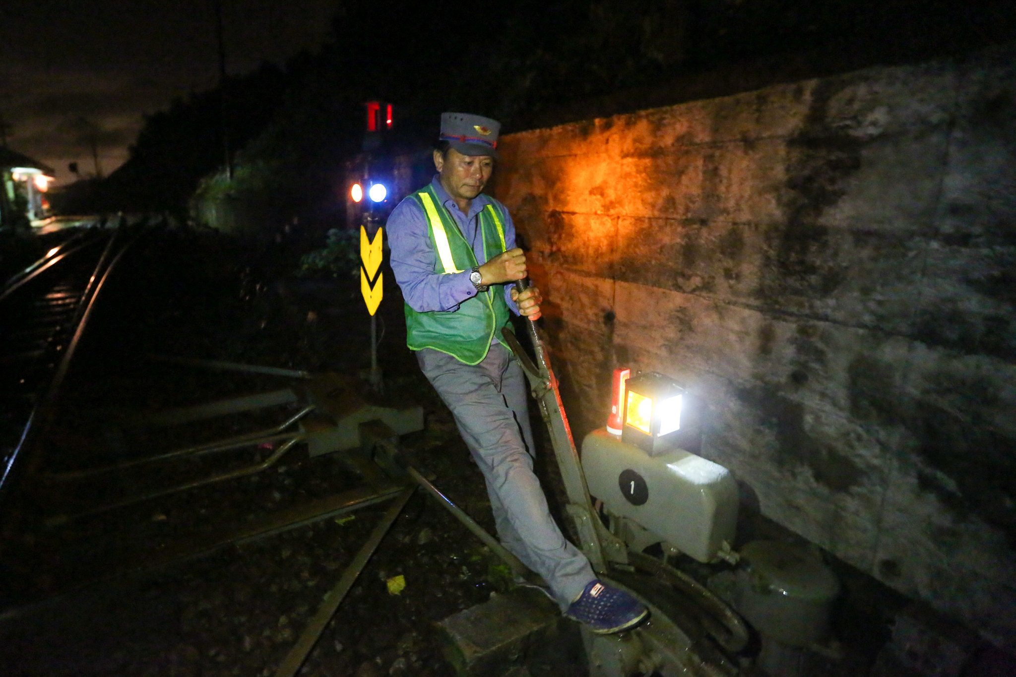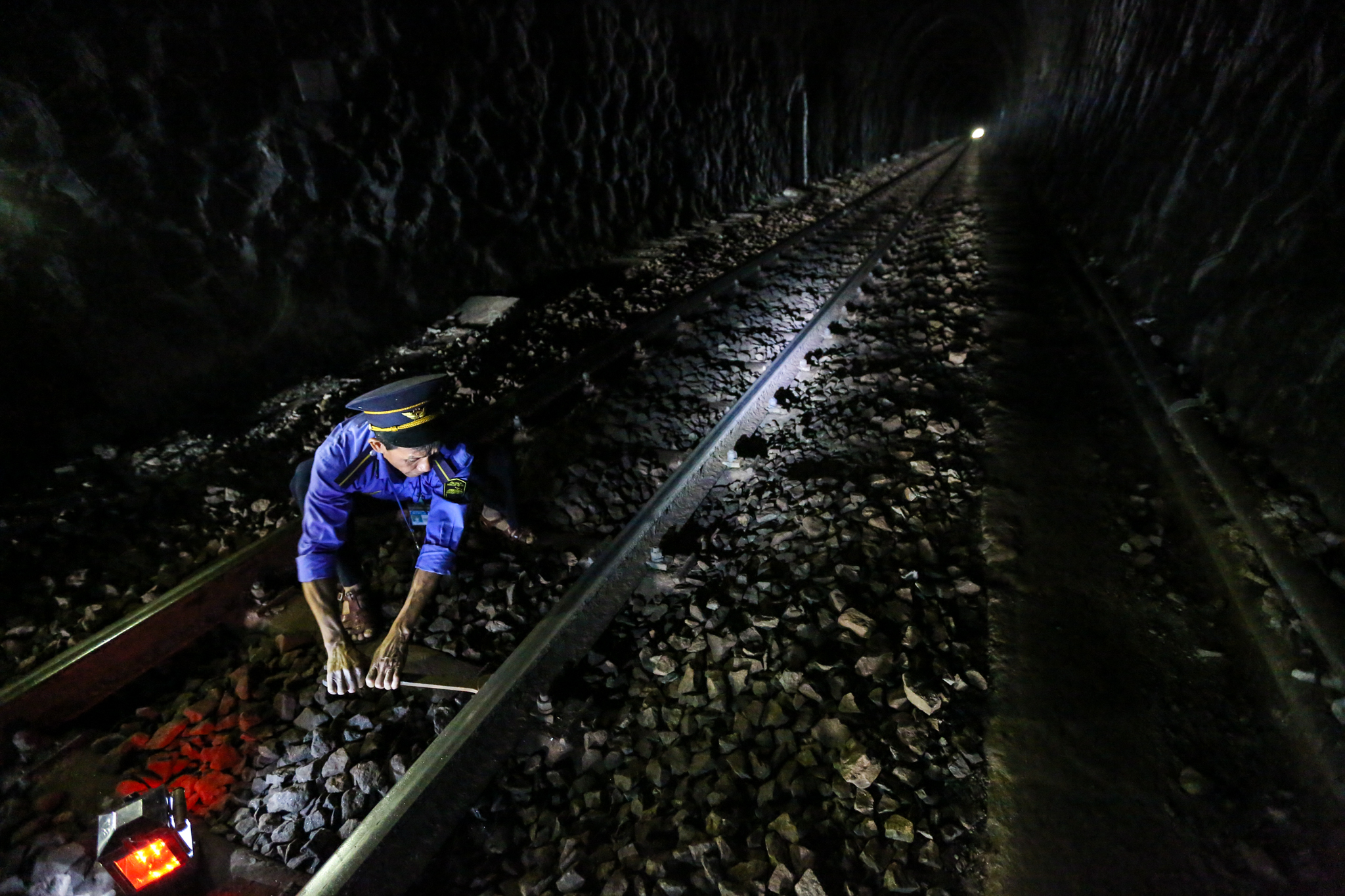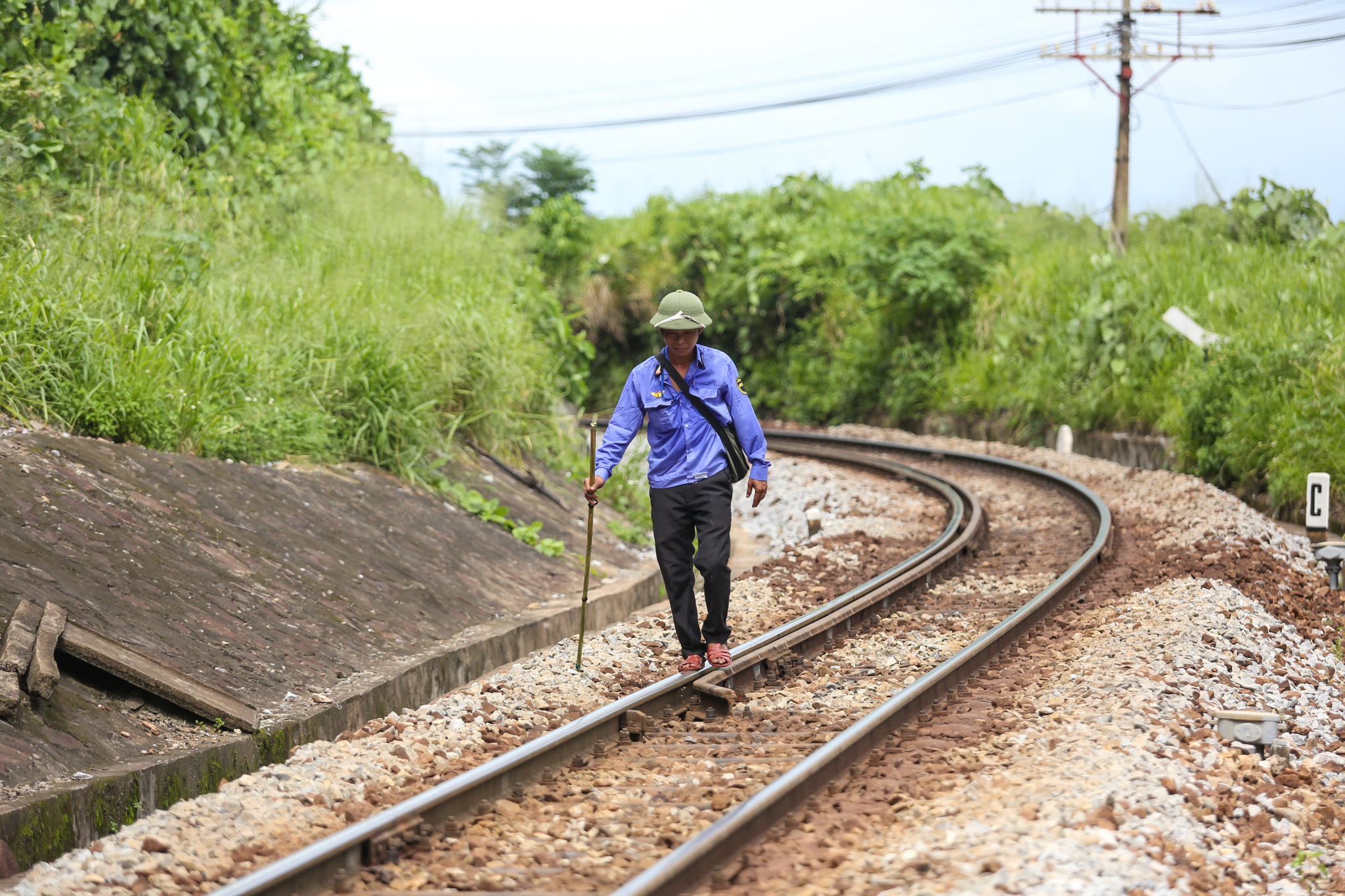 Nhiệm vụ chính của các công nhân thuộc hệ đi tuần là kiểm tra, phát hiện các hỏng hóc trên ray để kịp thời sửa chữa. Trong trường hợp có sự cố nghiêm trọng như có đất sạt lở, lũ cuốn trôi đường, họ sẽ chạy bộ ra cách khu vực hiện trường khoảng 600-800m, đặt pháo vào ray để khi tàu chèn qua, pháo nổ làm hiệu lệnh cho tài xế dừng lại. (Ảnh: Minh Sơn/Vietnam+)