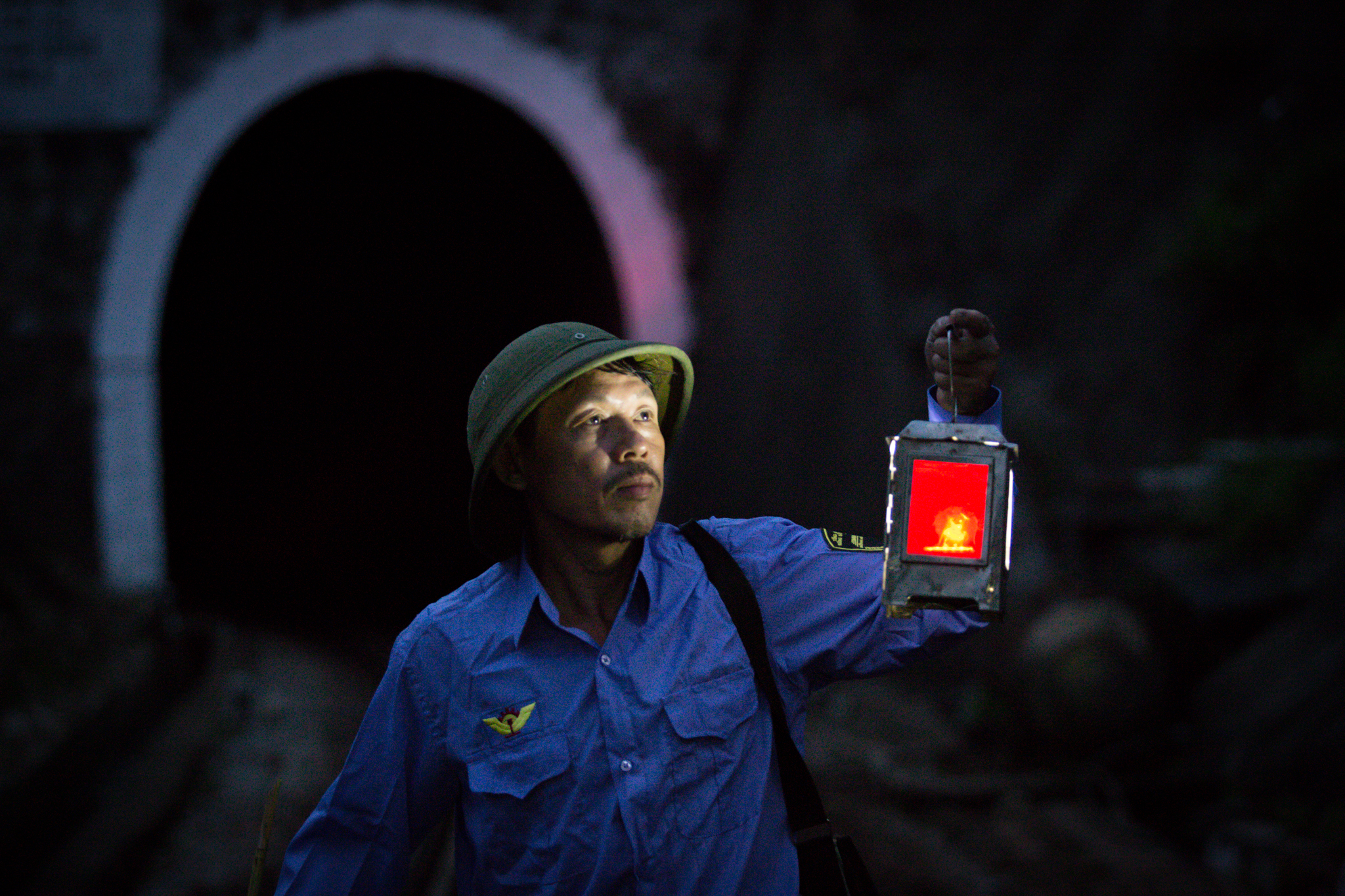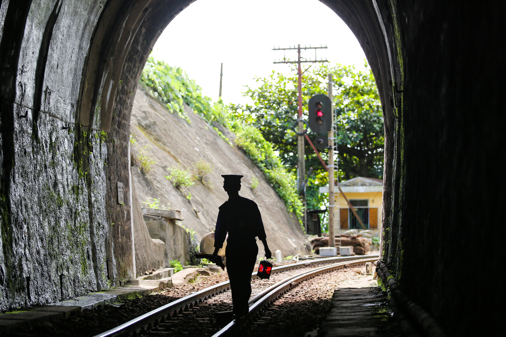 Tay trái cầm đèn pin, vai lủng lẳng túi đồ nghề, ông Định bắt đầu phăm phăm bước đi trên thanh ray nhỏ không đủ đặt trọn bàn chân người. Chỉ một quãng, cửa hầm số 12 đã hiện ra, sâu hun hút. Từ phía ngoài nhìn vào chỉ thấy bên trong đặc quánh bóng tối. (Ảnh: Minh Sơn/Vietnam+)