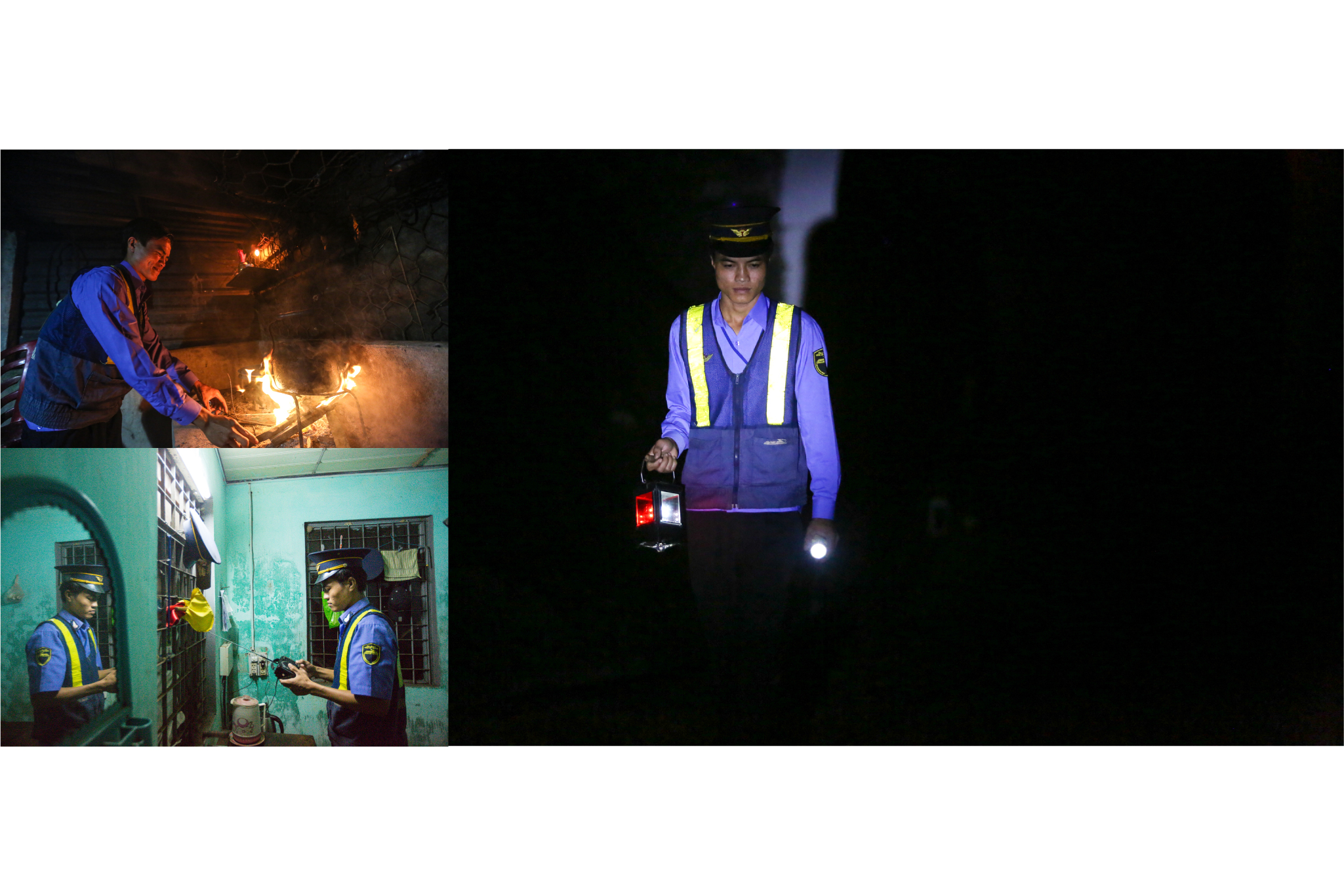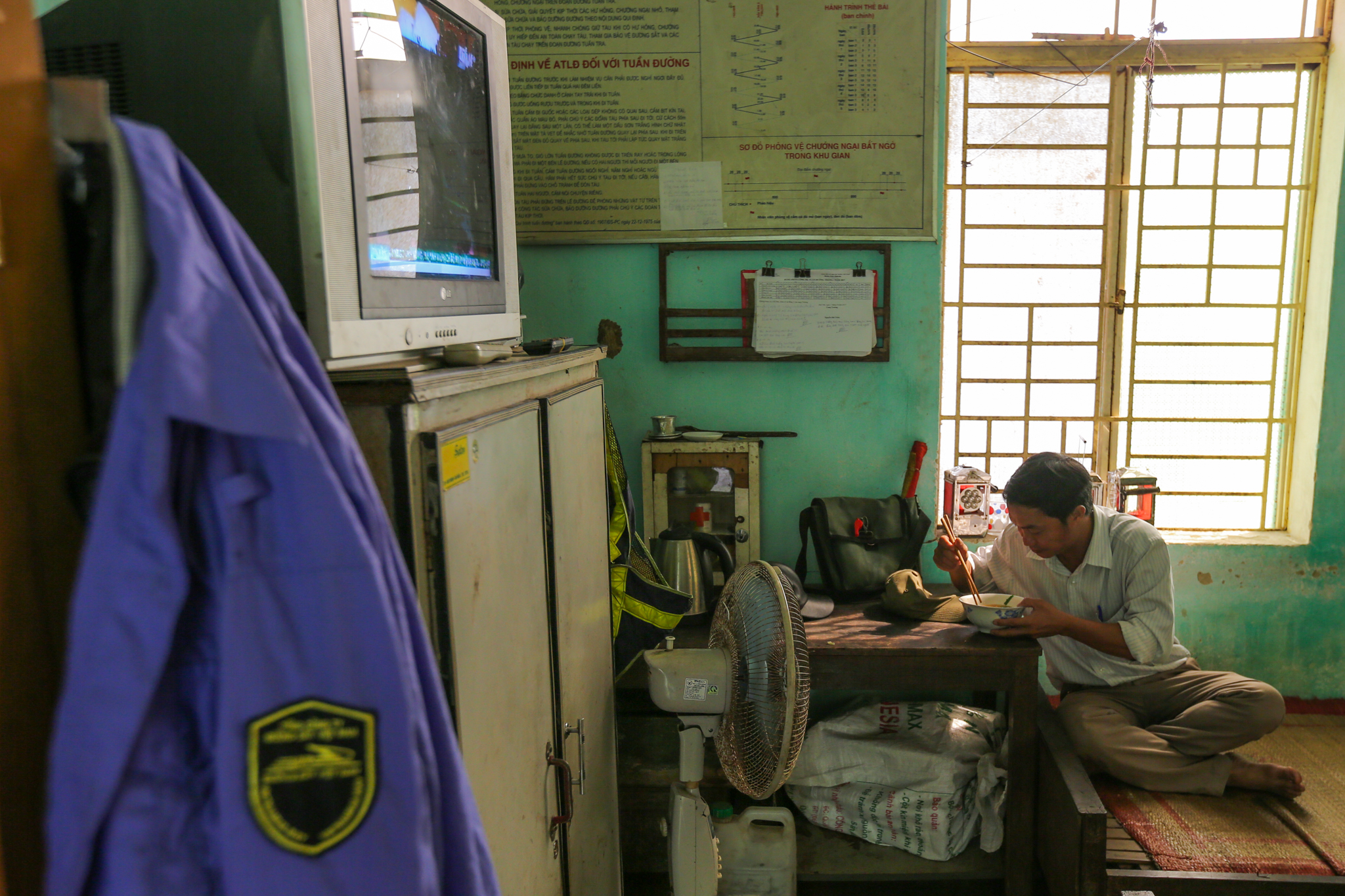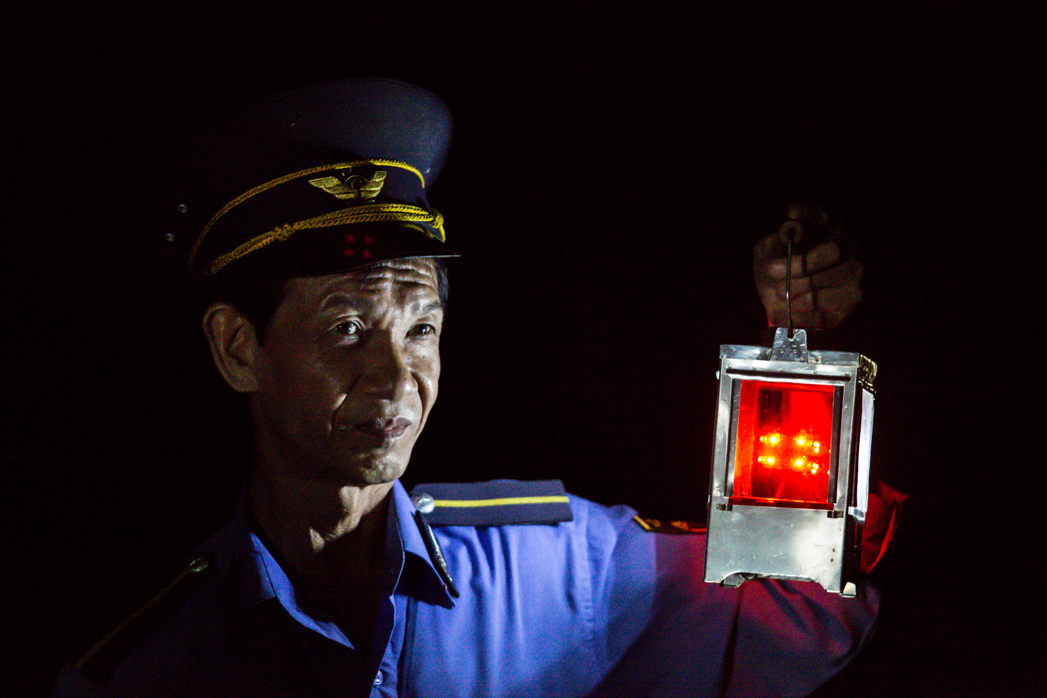 Công việc của những người như ông Định thoáng qua thì vô cùng đơn giản. Hàng ngày khi lên ban, ông chuẩn bị quần áo, mũ nón, kèn, đèn, cờ cùng pháo hiệu chỉnh tề rồi lầm lũi.... đi. (Ảnh: Minh Sơn/Vietnam+)