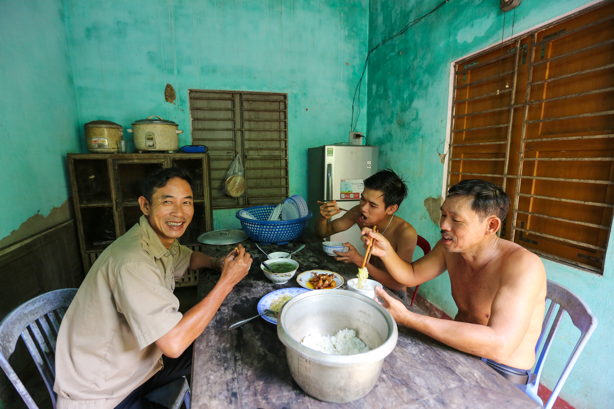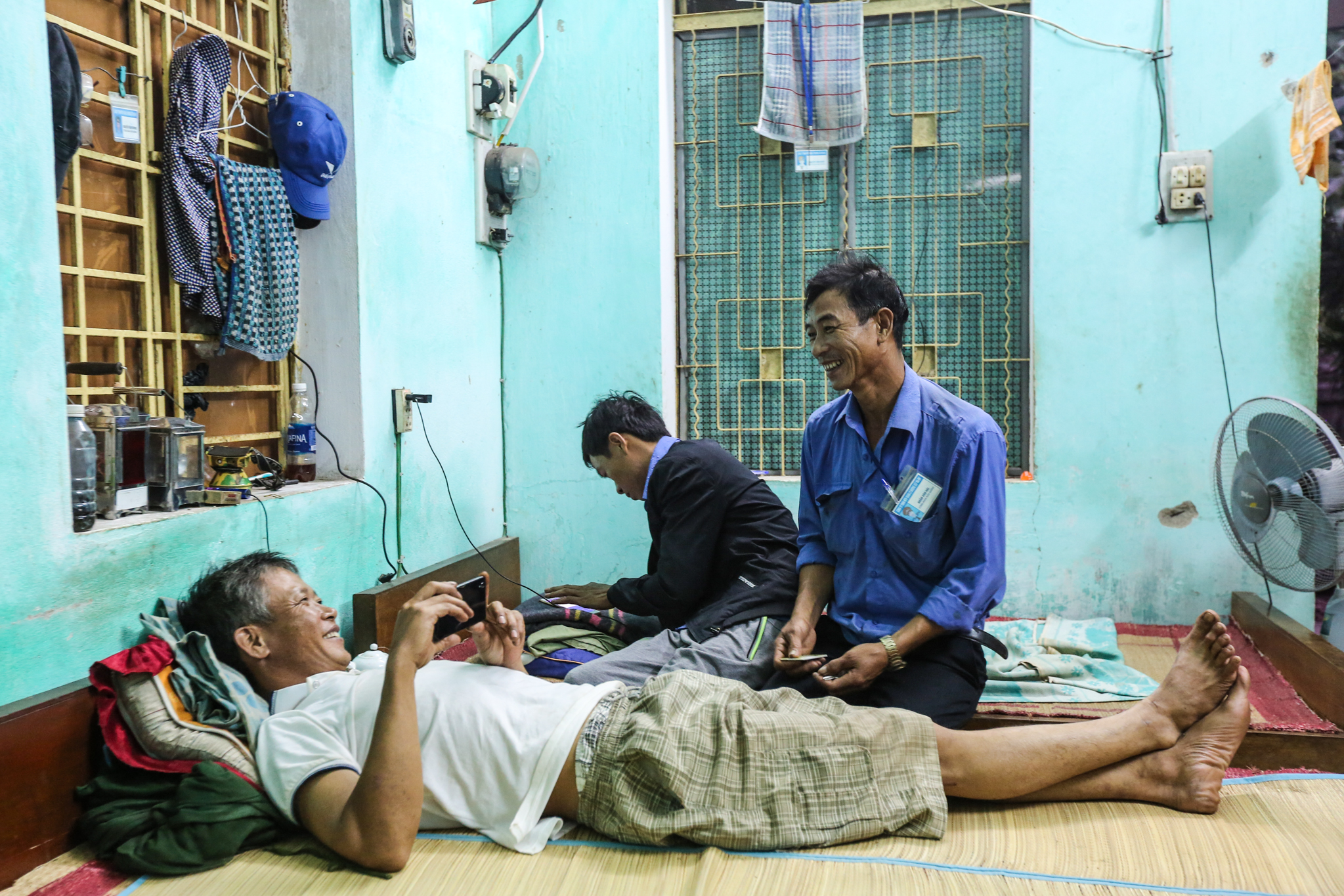 Buổi tối, khi công việc đã lắng xuống. Những "người lính" lại quây quần nghỉ ngơi trong căn phòng tập thể. Họ cười đùa, nói chuyện với nhau bằng những câu chuyện nghe đã nằm lòng. (Ảnh: Minh Sơn/Vietnam+)