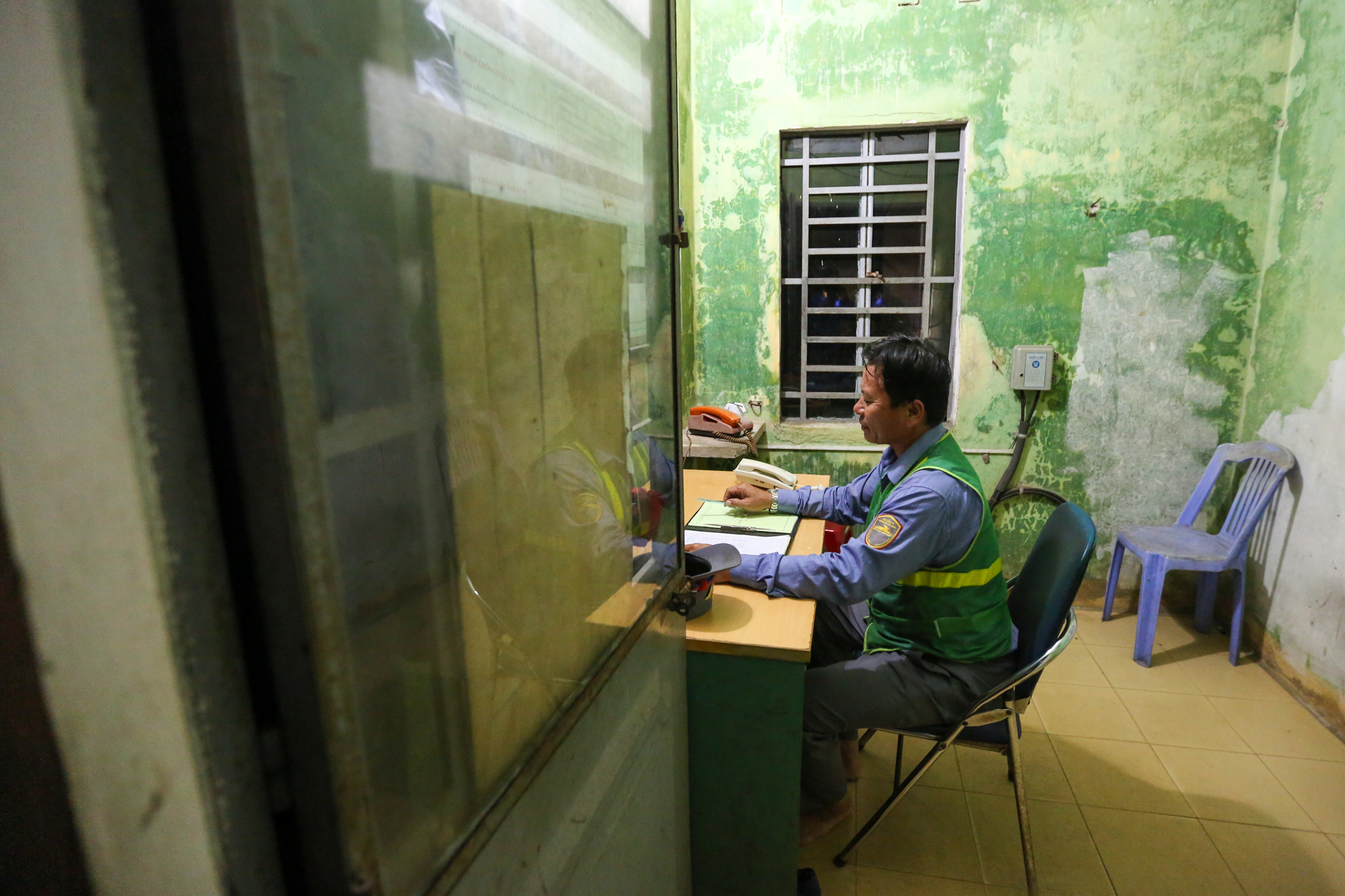 Chú Phan Viết Định (52 tuổi) là trực ban chạy tàu gần 30 năm nay. Công việc chính của chú Định là tổ chức chạy tàu, chống vượt, đảm bảo an toàn đường sắt. Công việc của chú Định đầy áp lực khi luôn luôn phải theo dõi sát sao lịch chạy của tàu nhằm đảm bảo các chuyến tàu được thông suốt không gặp trở ngại. (Ảnh: Minh Sơn/Vietnam+)