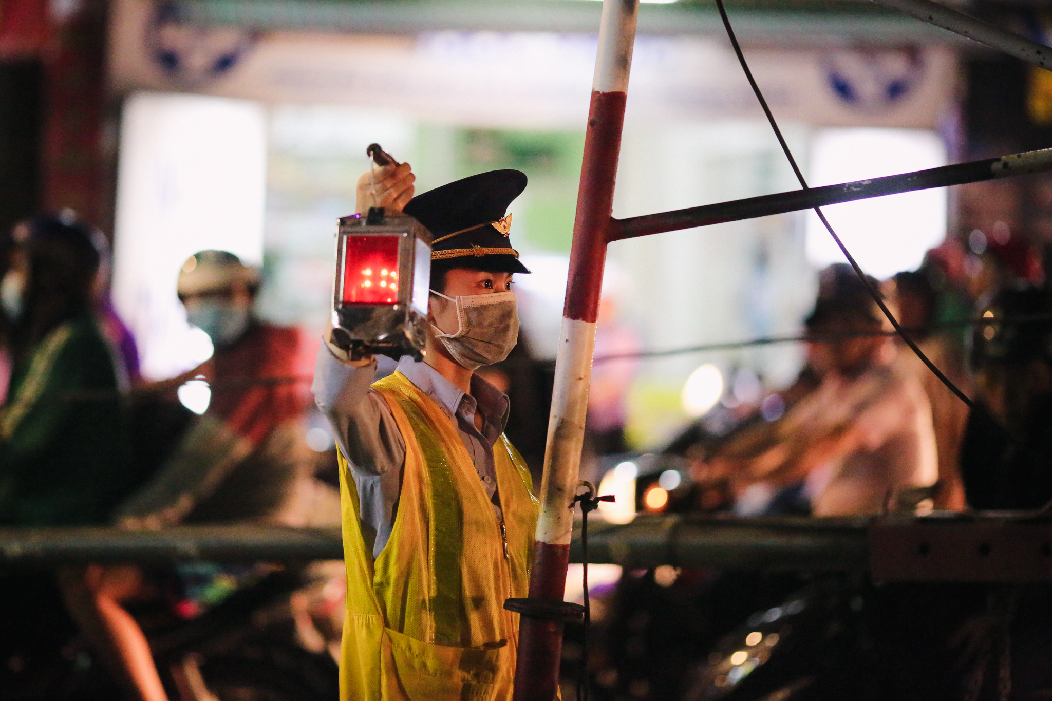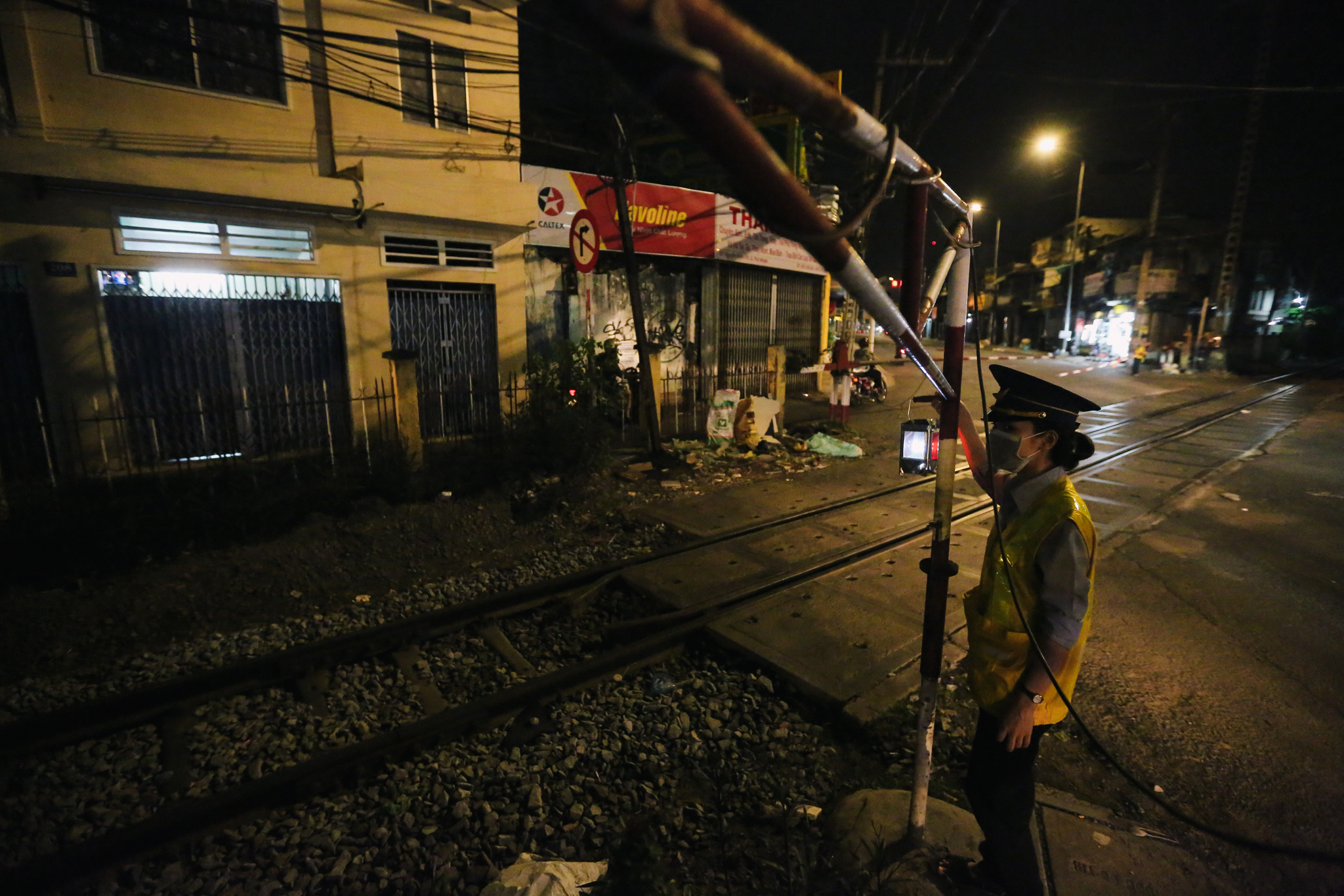 Mỗi chuyến tàu đi qua chỉ mất chừng 5 phút để hạ gác chắn. Thế nhưng, chỉ cần sơ sẩy một phút là ảnh hưởng đến tính mạng của biết bao nhiêu người. Kinh nghiệm gần 4 năm trong nghề đã dạy Yến không được chủ quan dù một giây. (Ảnh: Minh Sơn/Vietnam+)