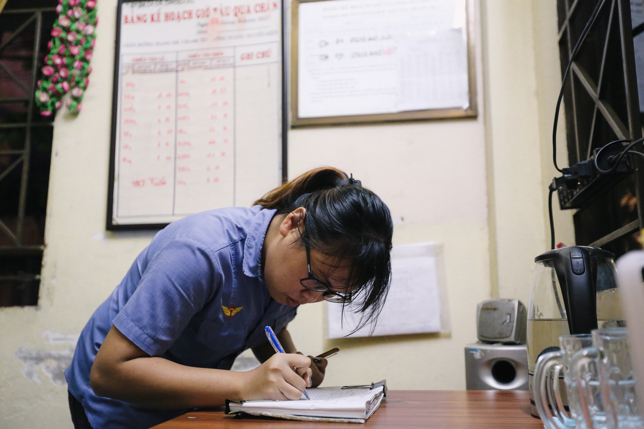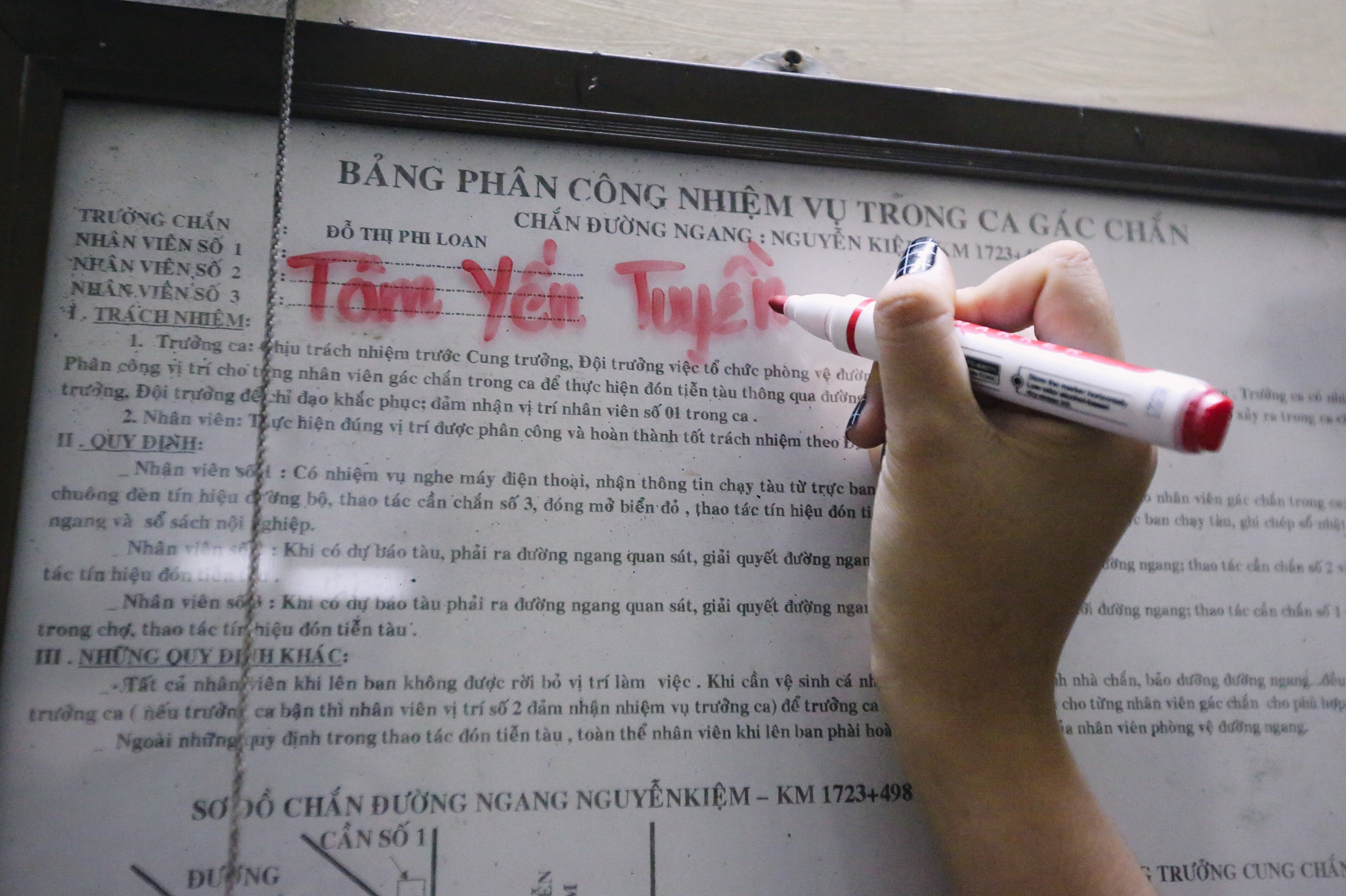 Công việc cứ thế tiếp diễn từ ngày này sang ngày khác như trực điện thoại, ghi chép lịch trình, xác định thời gian tàu chạy và kéo rào chắn để đảm bảo tàu được lưu thông an toàn. Chính vì thế, những cô gái như Tâm, việc phải làm trắng đêm đã không còn là điều lạ. (Ảnh: Minh Sơn/Vietnam+)