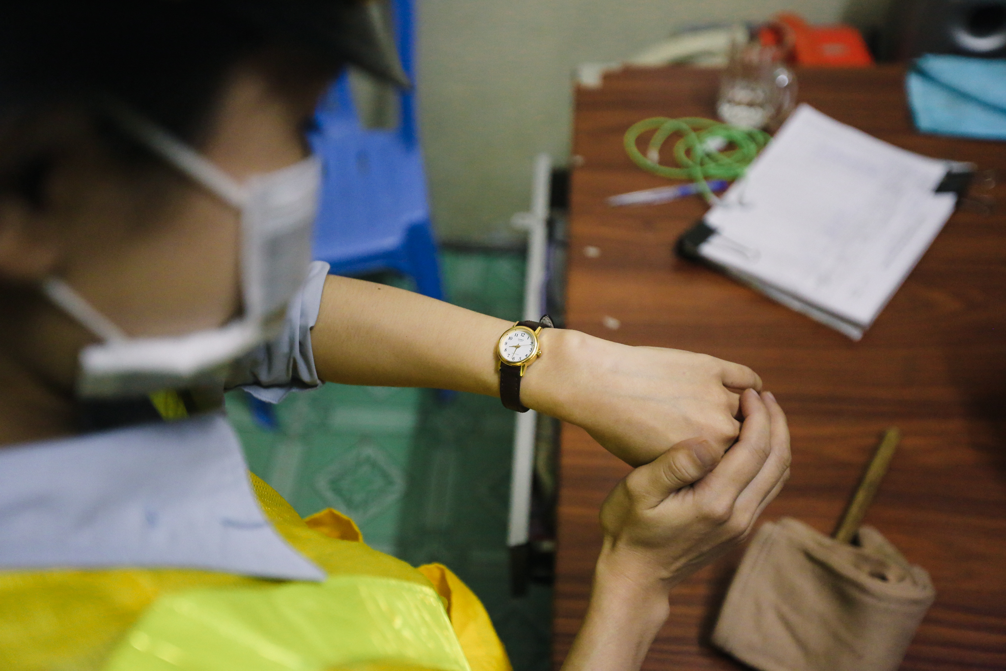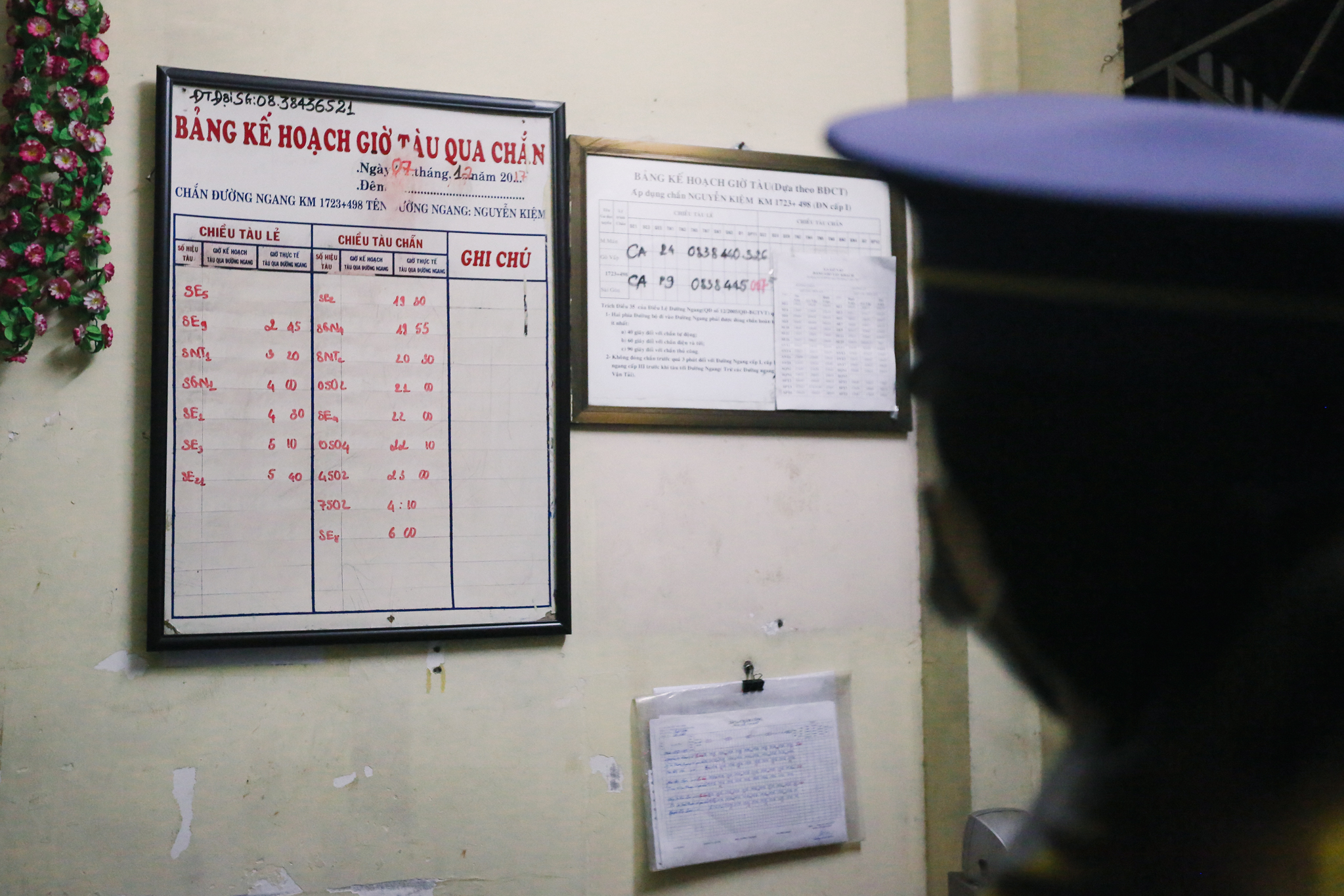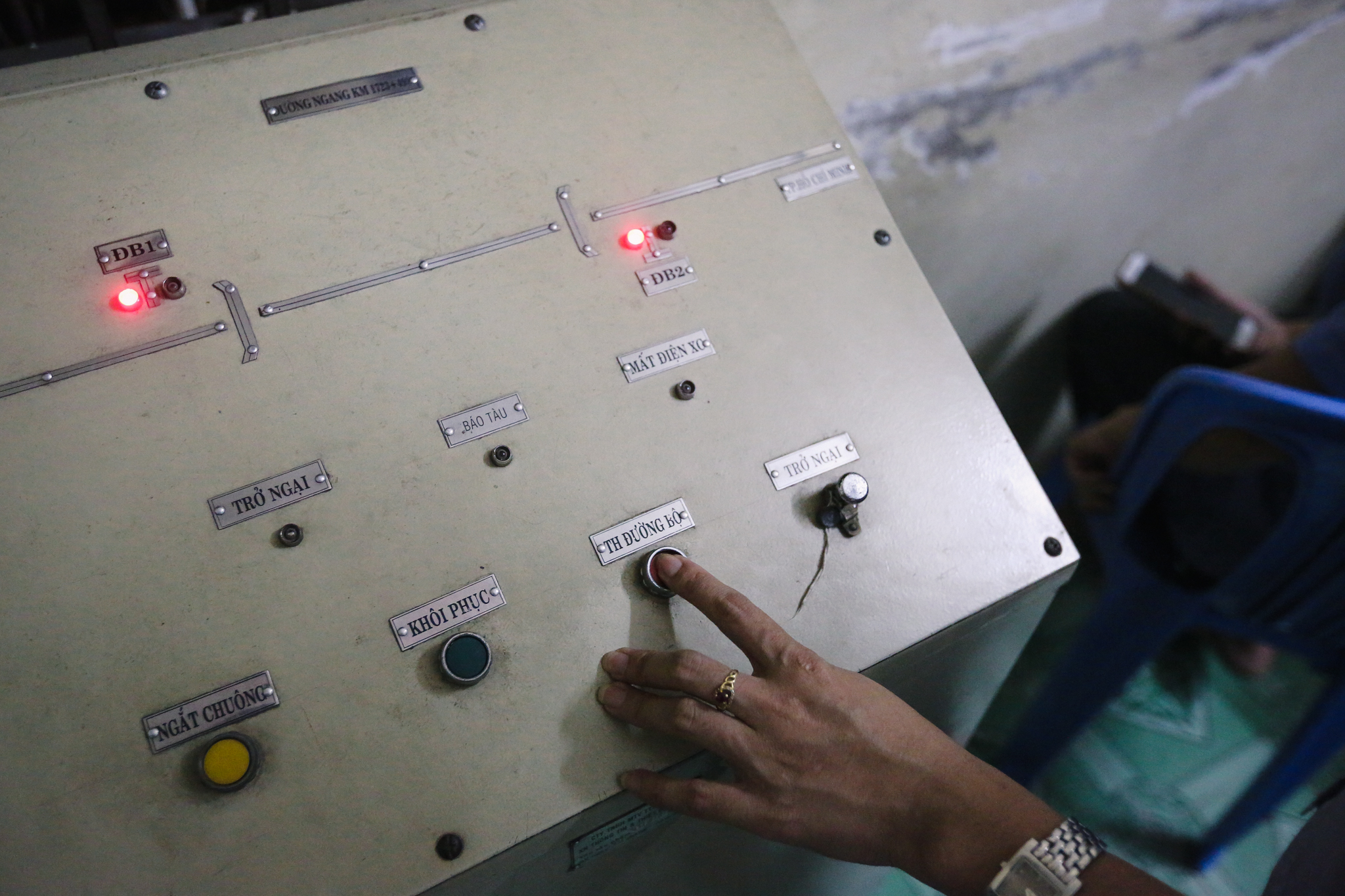 Khi chiếc điện thoại đặt trên bàn đổ chuông, ngay lập tức tất cả phải tập trung ra trước đường tàu để kéo barie cũng như báo hiệu cho tàu đi qua an toàn. (Ảnh: Minh Sơn/Vietnam+)
