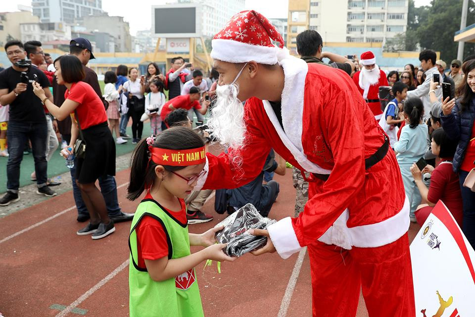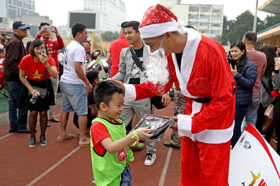 Hậu vệ Duy Mạnh và các đồng đội đã hóa thân thành ông già Noel để trao quà, ký tặng và giao lưu với các em nhỏ mang đến sự hào hứng cho tất cả những người có mặt trên sân Hàng Đẫy.