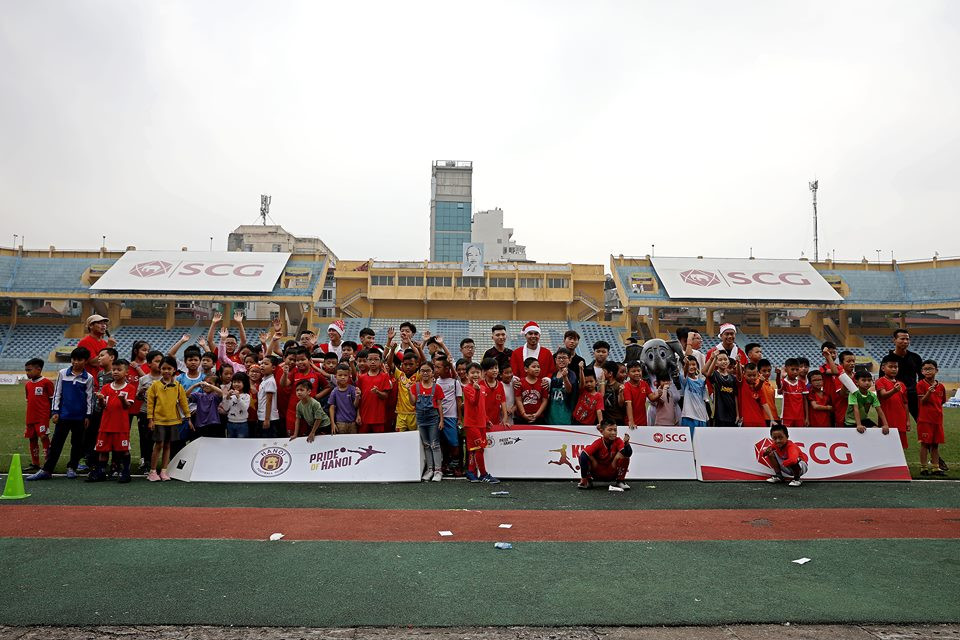 Ngay trước thềm lễ Giáng sinh 2018, các cầu thủ của đội tuyển bóng đá Việt Nam cùng Câu lạc bộ Hà Nội là Duy Mạnh, Đức Huy và Thành Chung đã góp mặt trong một sự kiện dành cho thiếu nhi trên sân Hàng Đẫy. Trong ảnh: Hậu vệ Duy Mạnh và các đồng đội đã hóa thân thành ông già Noel để trao quà, ký tặng và giao lưu với các em nhỏ mang đến sự hào hứng cho tất cả những người có mặt trên sân Hàng Đẫy.