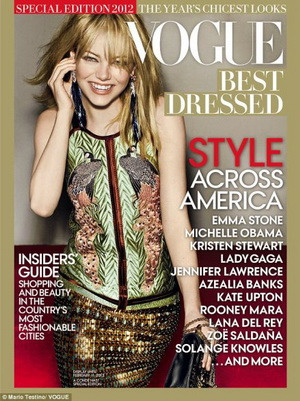 Vượt qua nhiều gương mặt đình đám, Emma Stone đã trở thành Nữ hoàng thời trangnăm 2012 do tạp chí danh giá Vogue bình chọn. Đương nhiên, người đẹp 24 tuổichính là ngôi sao trên trang bìa tạp chí Vogue phiên bản ấn hành Những ngôi saomặc đẹp nhất năm 2012.
