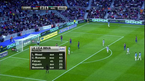 Cụ thể, khi thời gian bước sang phút 36, trên màn hình của kênh ESPN bỗngxuất hiện bảng thành tích các chân sút tốt nhất Liga mùa này trong cuộc đua giành Pichichi. Theo đó, Messi đãcó 44 bàn, Ronaldo đứng ngay sau với 43 lần lập công.