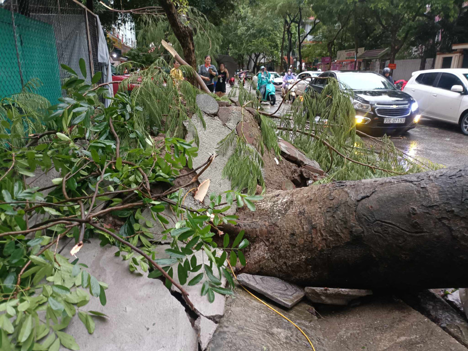Cơn mưa bất ngờ đổ bộ kèm gió tương đối mạnh chiều 6/9 đã khiến nhiều cây trên đường phố Hà Nội bật gốc, đè bẹp xe ôtô, gây thiệt hại ban đầu khi siêu bão số 3 còn chưa chính thức đổ bộ.
