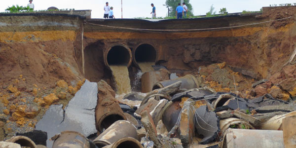 Vào thời điểm 13 giờ, hố đã lan rộng sang phần đường bên cạnh (Ảnh: Sơn Bách/Vietnam+)