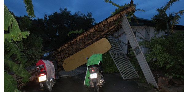 Lốc đánh sập cổng chợ Gỗ, Đức Giang, Long Biên (Ảnh: CTV Lê Hương)