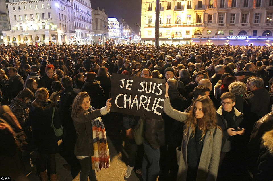 “Je suis Charlie”: Nhiều người biểu tình giơ khẩu hiệu “Tôi là Charlie” ủng hộ cho những phóng viên của Charlie Hebdo bị sát hại.