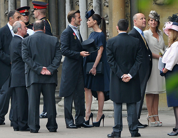 Vợ chồng Beckham và Victoria đến Westminster từ khá sớm. Becks mặc áo đuôi tôm, đeo huân chương tước Hiệp sĩ do Nữ hoàng Elizabeth II trao tặng, còn Vic thì mặc đồ do cô tự thiết kế.
