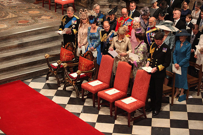 Các thành viên Hoàng gia ổn định chỗ ngồi trước khi cử hành hôn lễ.