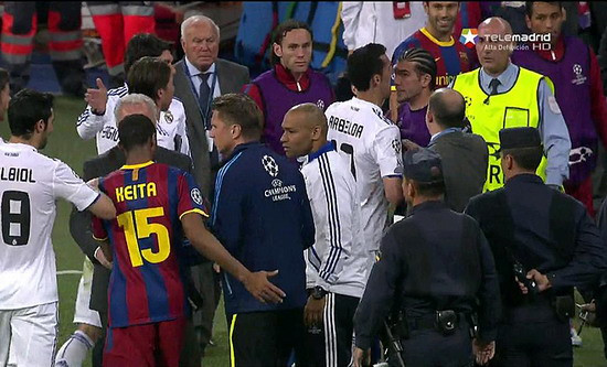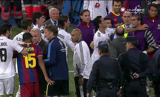 Trong vụ xô xát này còn có cả sự tham gia của tiền vệ Keita bên phía Barca và trợ lý Chendo của Real. Hiện chưa rõ nguyên nhân của vụ xô xát, nhưng bầu không khí trên sân rất căng thẳng và hai bên thường xuyên có những pha phạm lỗi thô bạo. Đầu hiệp hai thì Pepe của Real đã bị đuổi khỏi sân do phạm lỗi với Alves. Sau đó, tới lượt huấn luyện viên Jose Mourinho của Real cũng bị đuổi lên khán đài do phản đối trọng tài.