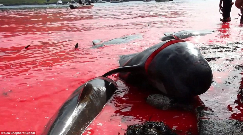 Khoảng 250 con cá voi đã bị giết hại dã man trên hai bãi biển Bour và Torshvan ở đảo Faroe, trong một lễ hội được tổ chức thường niên mà người địa phương gọi là “grindadrap”.