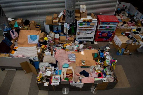 Một người đi sơ tán nằm ở “góc nhà” đặt tại trung tâm hội nghị Big Palette ởKoriyama./.