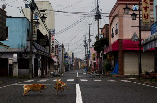 Đây là một tấm ảnh khác trong bộ 12 tấm ảnh nói trên, chụp cảnh hai chú chótrong một thị trấn không người tại Okuma.