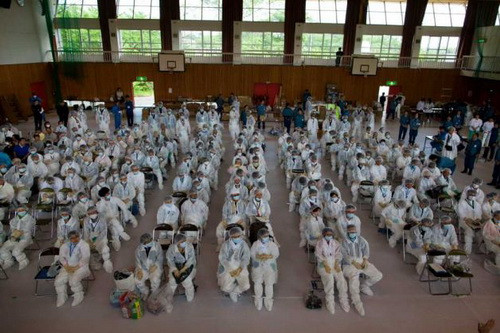 Tấm ảnh được thực hiện ngày 8/6/2011, chụp cảnh các cư dân tại Hirono mặc nhữngbộ quần áo bảo vệ khỏi phóng xạ, ngồi trong một phòng tập thể dục trước khi đượchộ tống về nhà nằm trong khu vực bị ảnh hưởng bởi phóng xạ để thu thập tư trang,dưới sự giảm sát chặt chẽ của chính quyền.