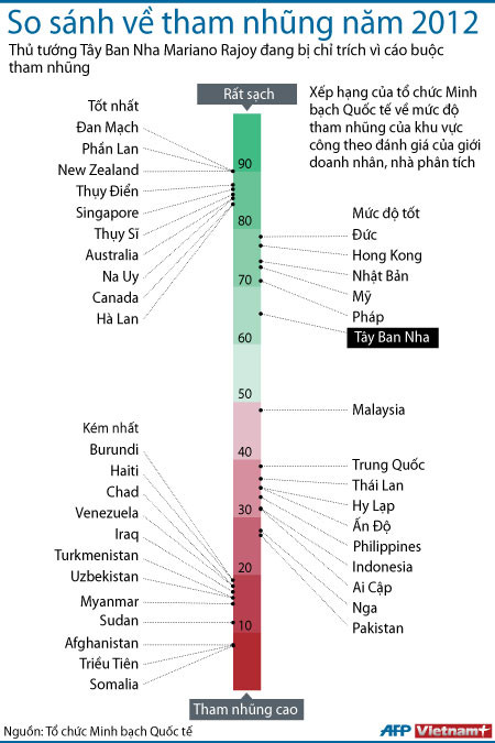 Theo đó, Đan Mạch, Phần Lan và New Zealand là ba nước đạt mức độ "sạch" nhất về vấn nạn tham nhũng. Các vị trí cao khác là Thụy Điển, Singapore, Thụy Sĩ, Australia, Na Uy... Tây Ban Nha vẫn là nước có mức độ "tốt" song Thủ tướng nước này thì đang bị cáo buộc tham nhũng.